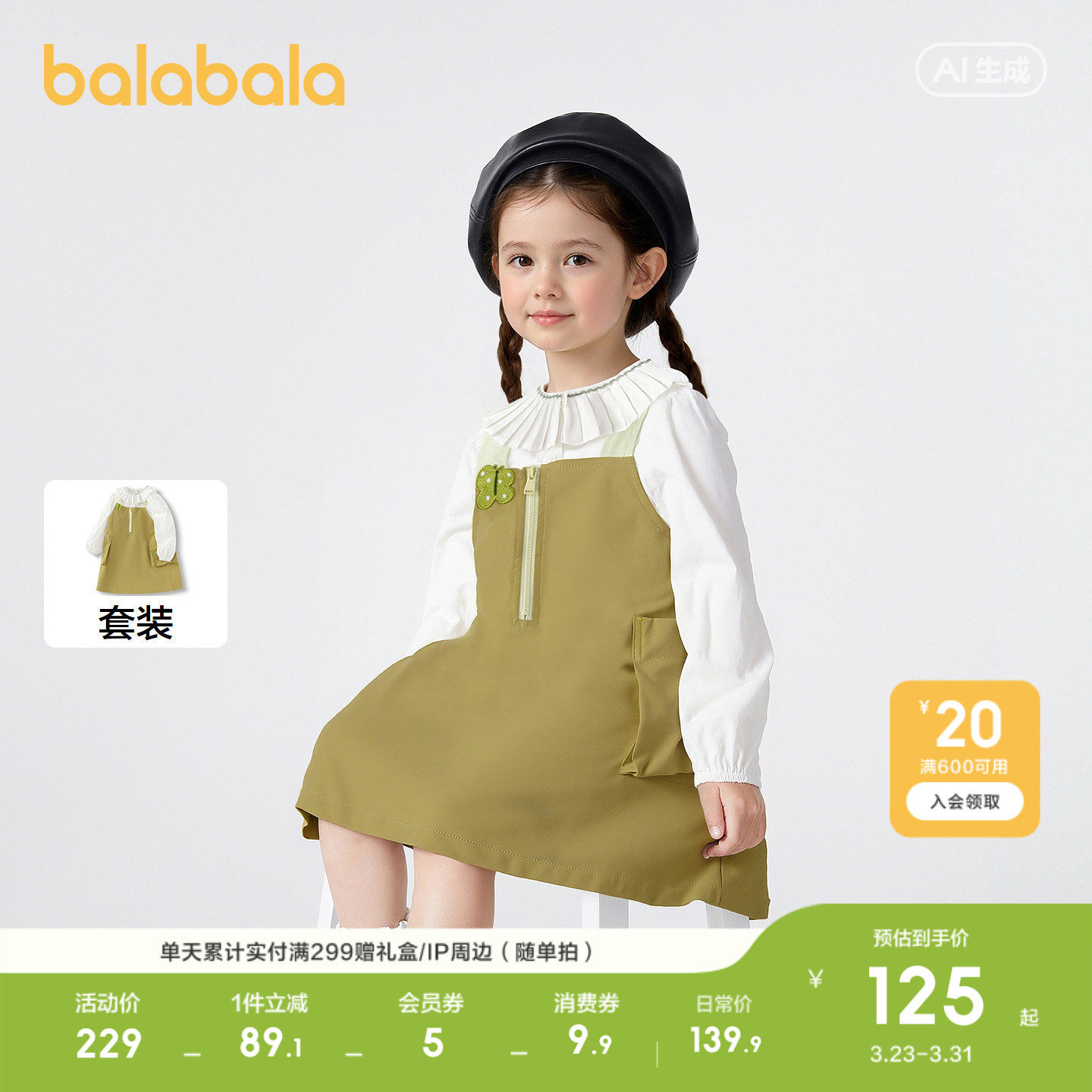 巴拉巴拉童装儿童连衣裙女童春秋装背带裙两件套口袋绣花甜美洋气