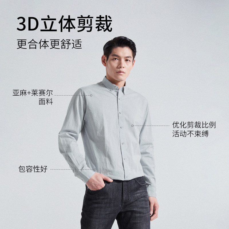 杉杉官方亚麻衬衫男士新款莱赛尔亲肤透气休闲长袖衬衣商务外套