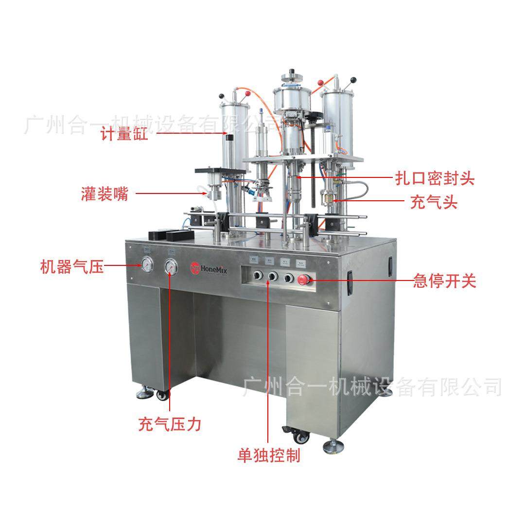 半自动灌装扎口充气三合一气雾罐灌装机清新剂防晒定妆喷雾罐装机