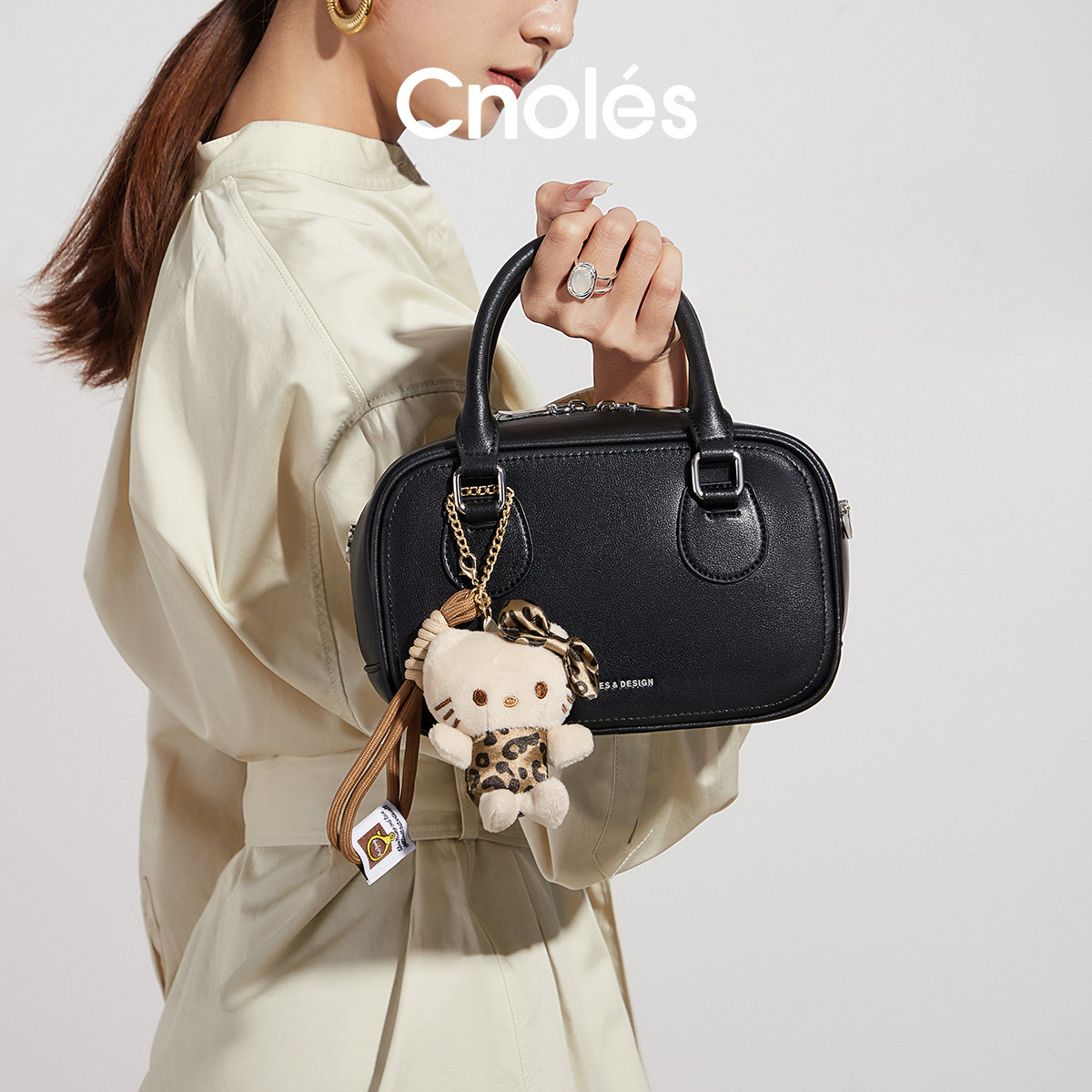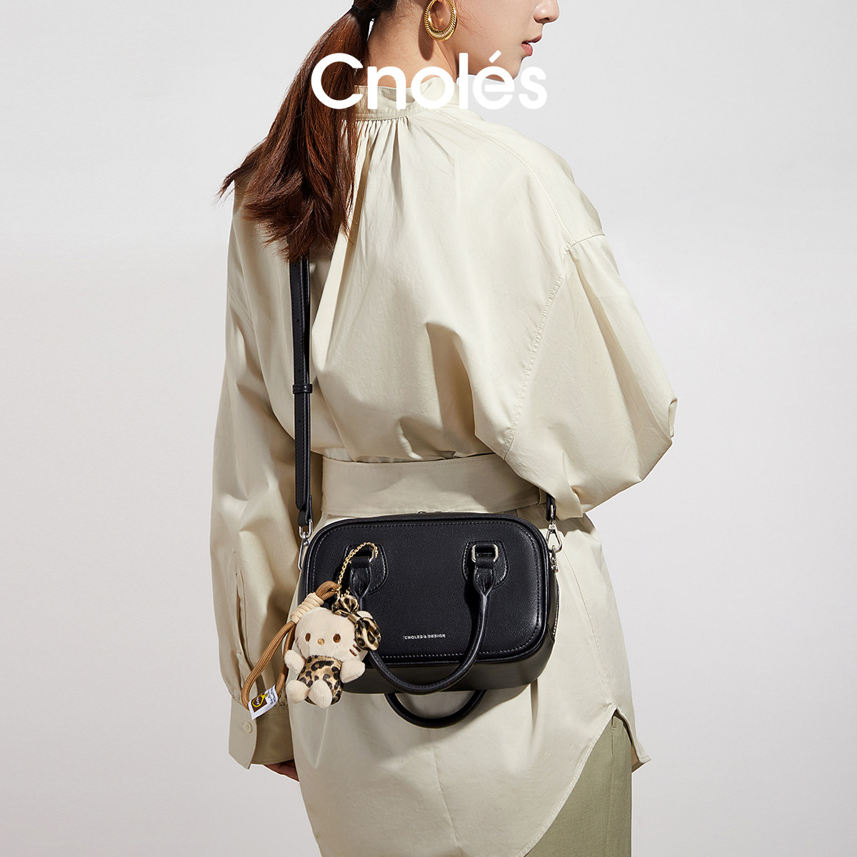 Cnoles蔻一简约保龄球包女牛皮手提包女式2025新款斜挎包波士顿包