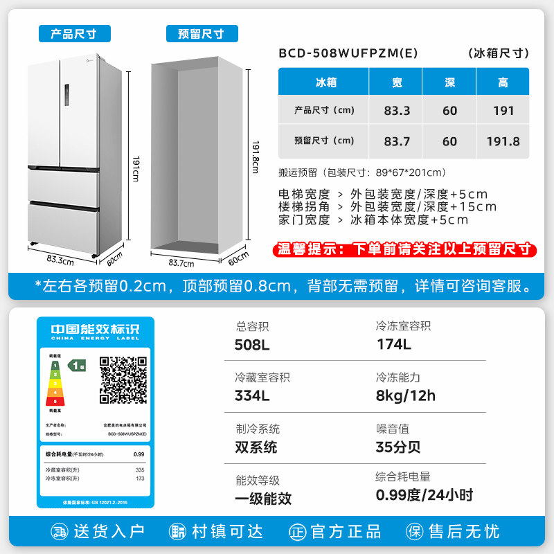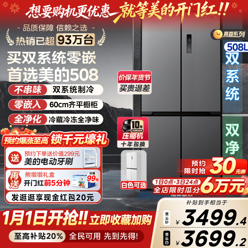 美的508双系统超薄零嵌入式冰箱家用大容量双开十字四门多门无霜
