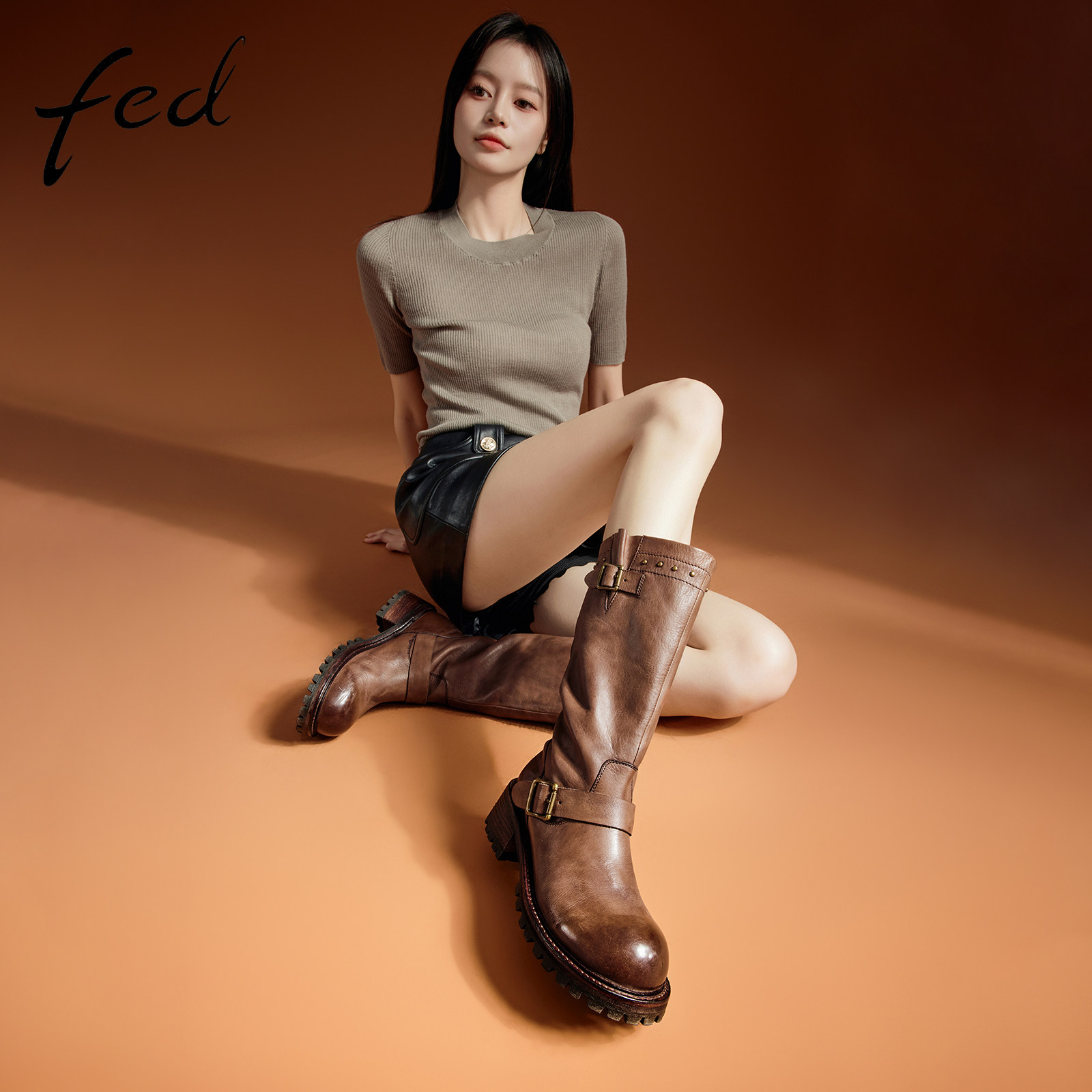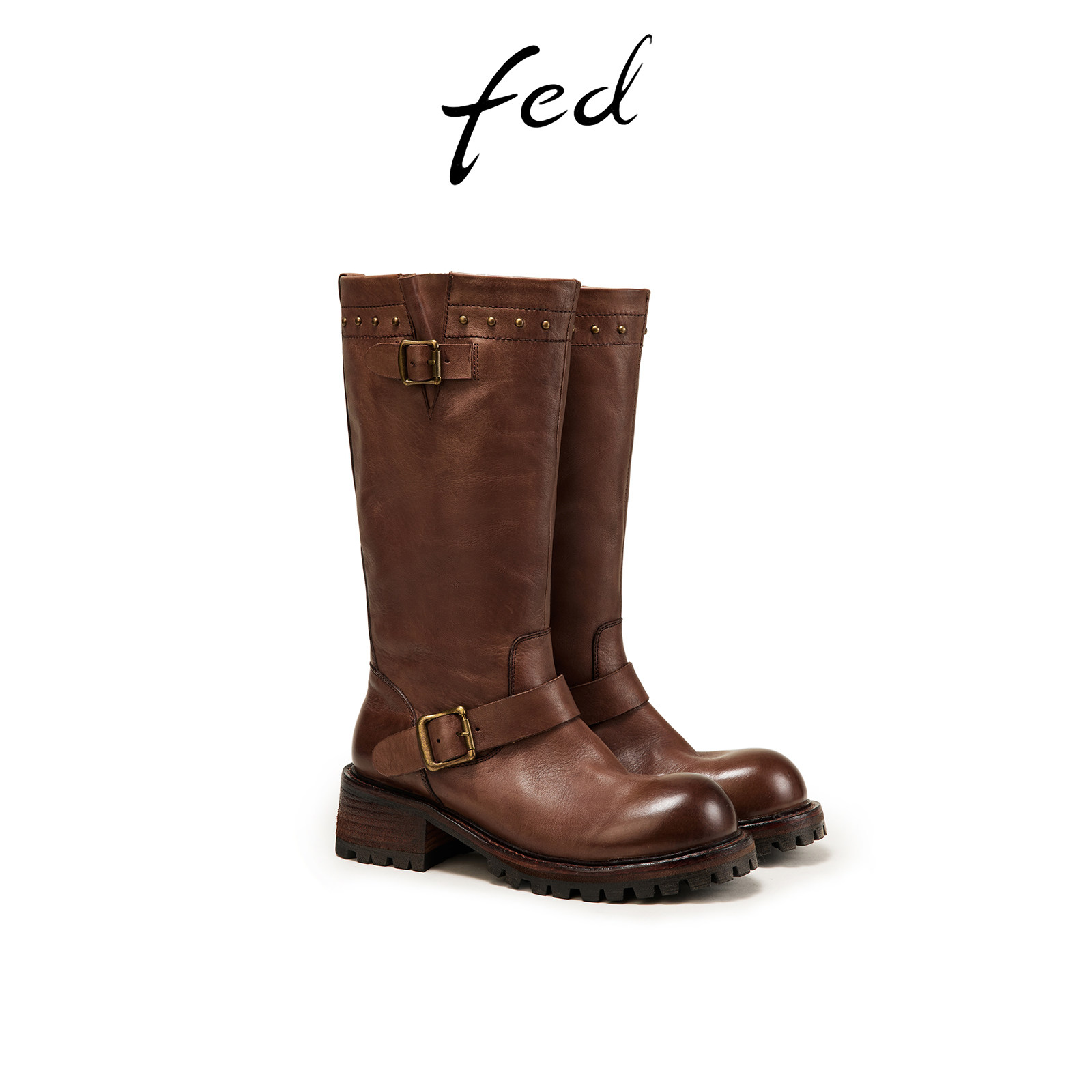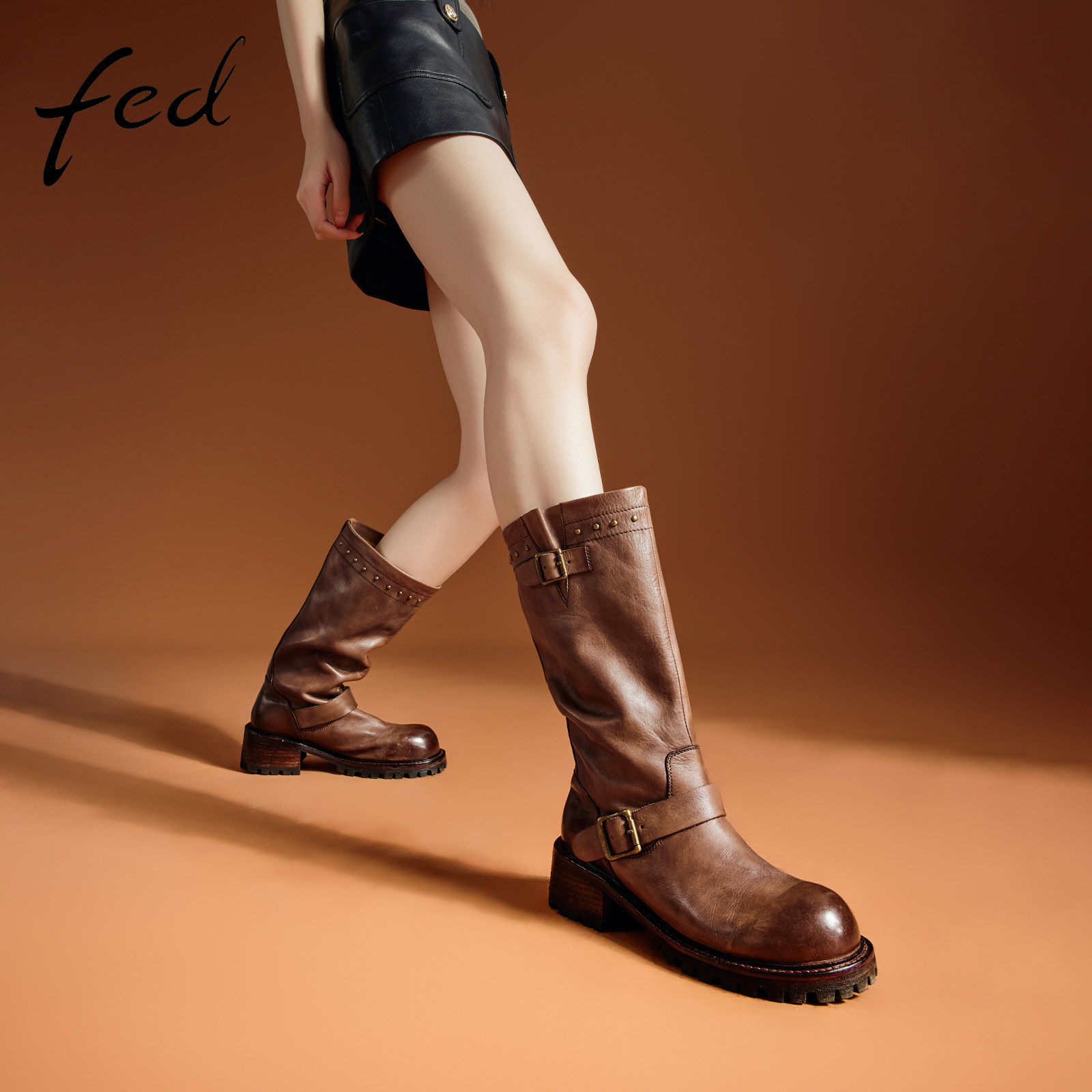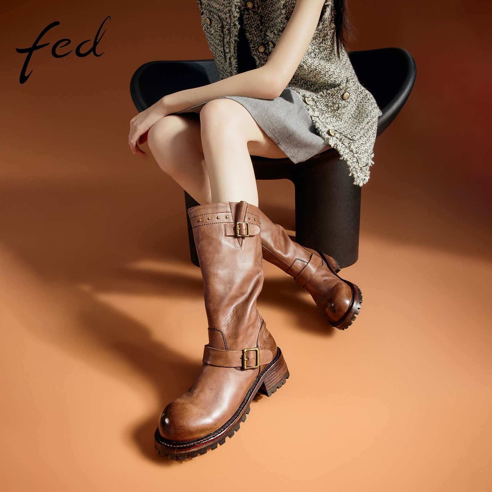 【水洗牛皮】fed复古中筒靴冬季新款女靴圆头时装靴D1105-ZFA226