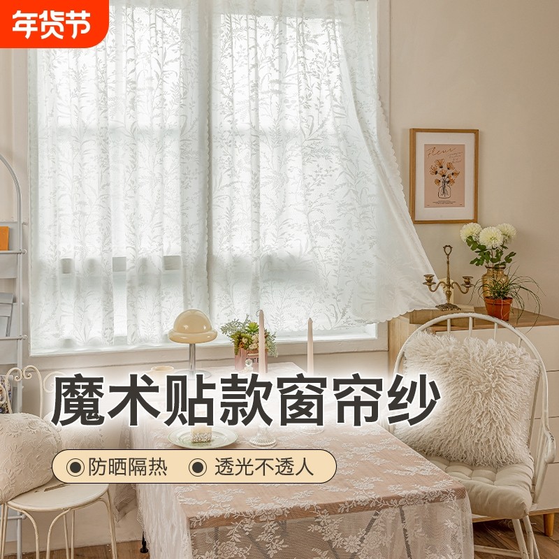 魔术贴免打孔纱窗纱飘窗阳台白纱粘贴窗帘百叶卧室防晒透光不透人