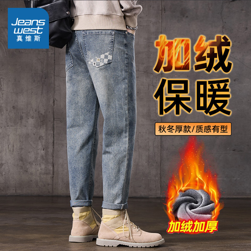 XUB真维斯男装显高加绒锥形牛仔裤2025冬季新品男士港风水洗长裤