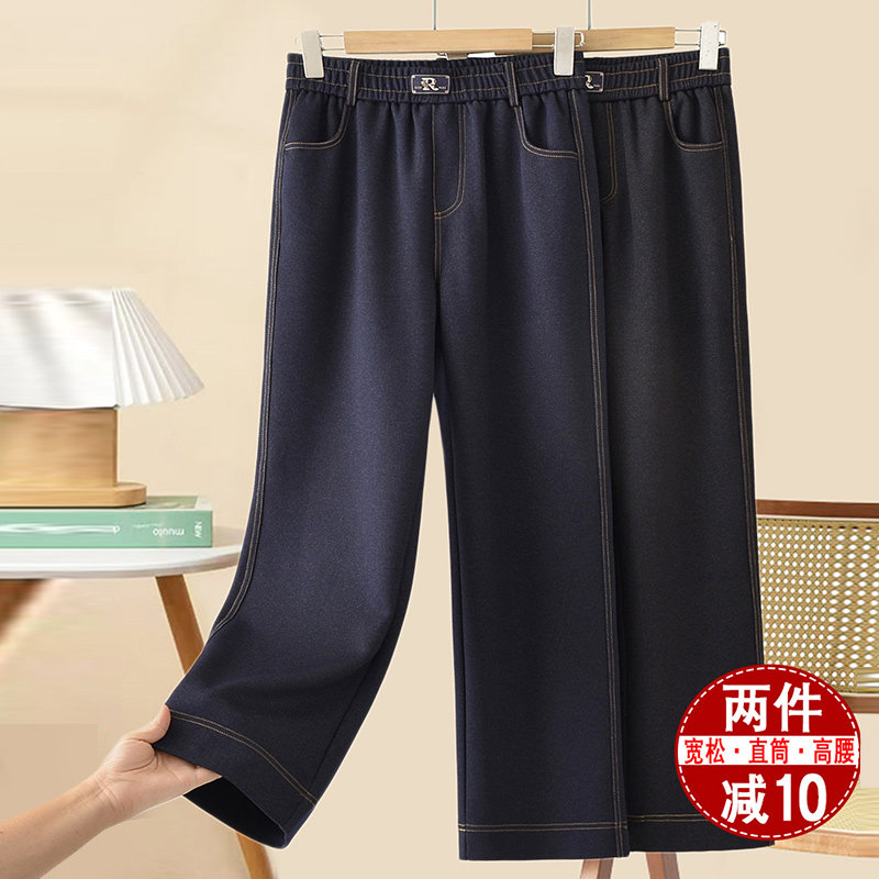 妈妈新款夏季薄款棉麻直筒裤大码宽松高腰九分裤老人松紧亚麻裤子