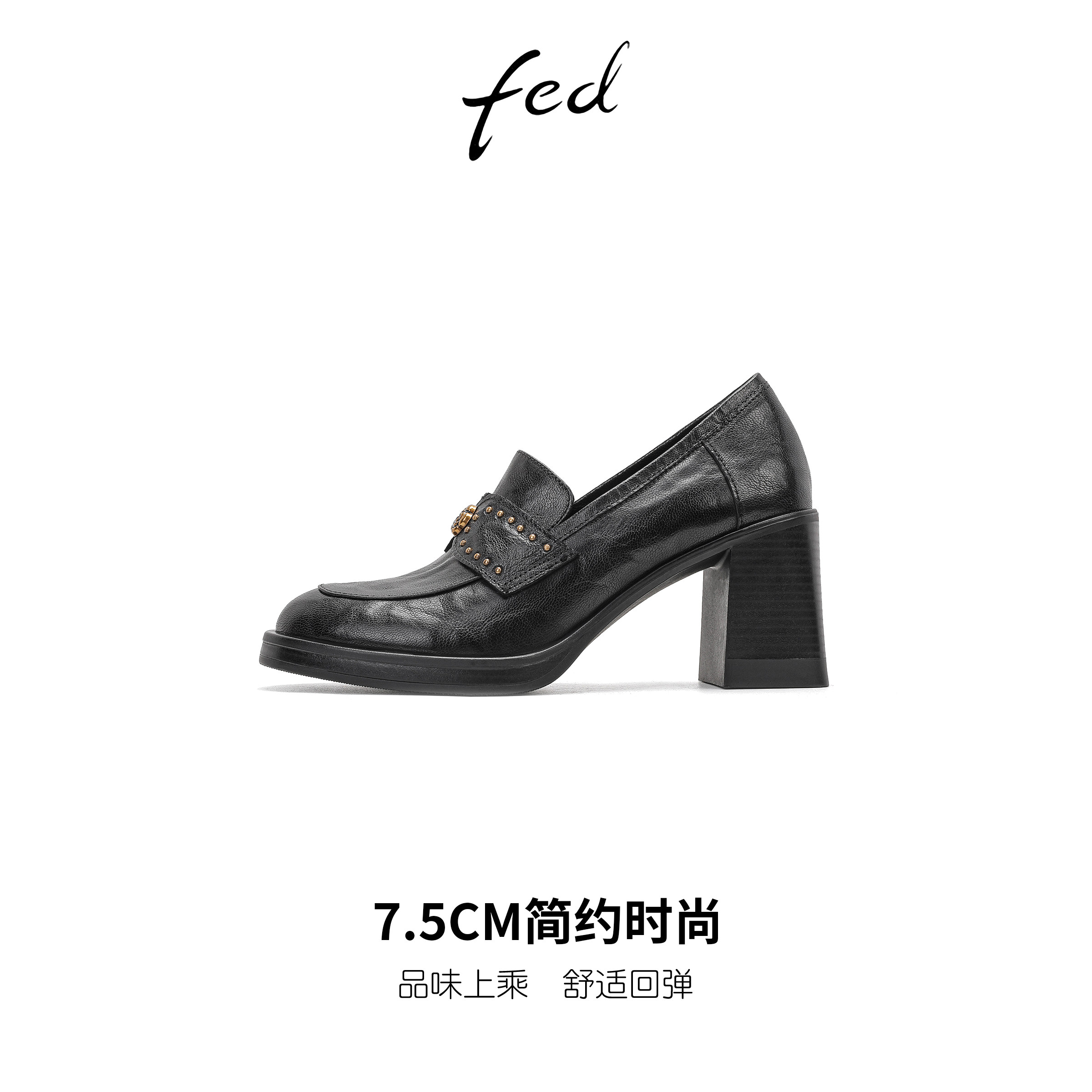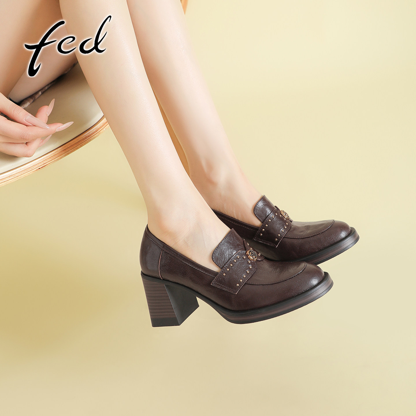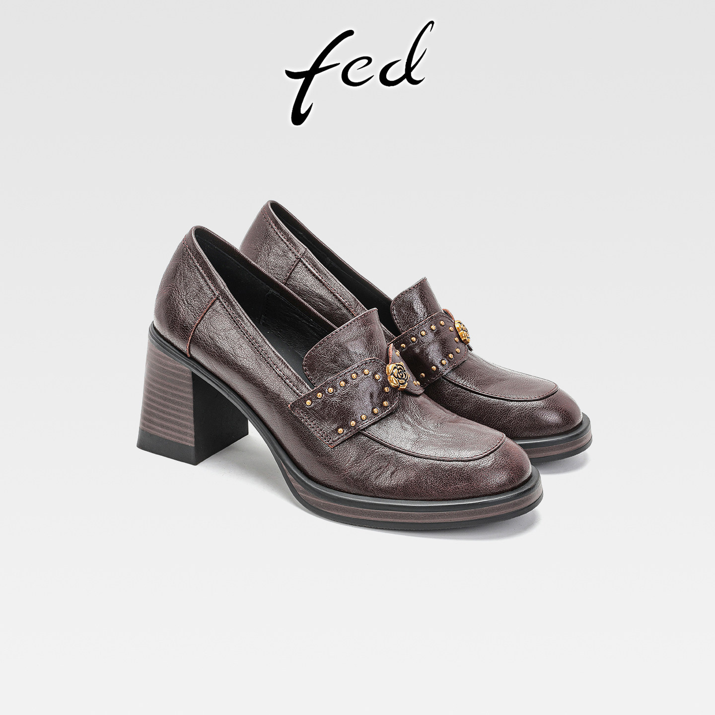 fed羊皮粗跟厚底山茶花铆钉乐福鞋女复古小皮鞋圆头高跟深口单鞋