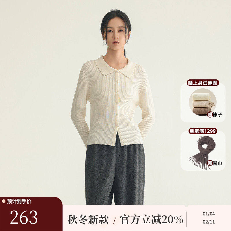 AIRIQI冬季新款简约翻领细坑条羊毛修身长袖针织开衫女AH44KS546