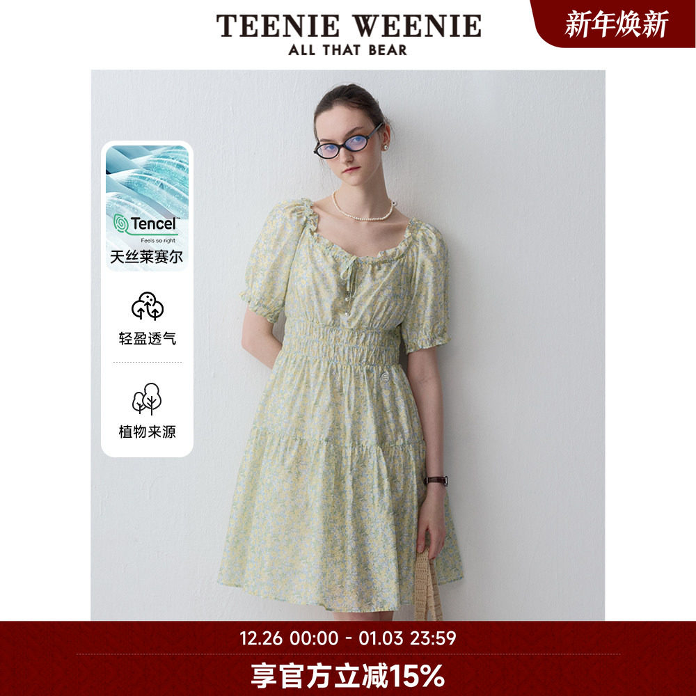 【天丝混纺】TeenieWeenie小熊奥莱薄荷绿花朵轻薄短裙收腰连衣裙