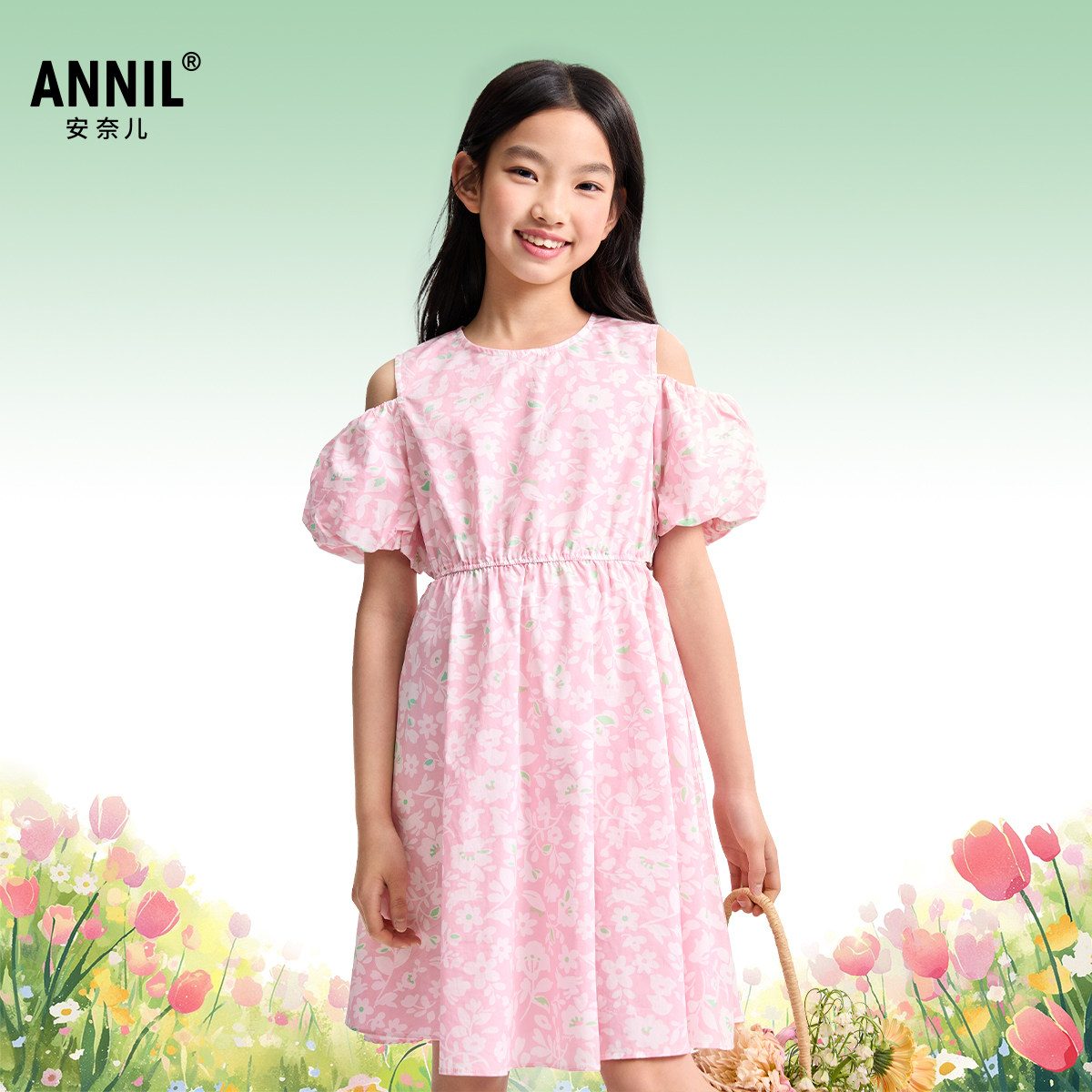安奈儿童装女童短袖连衣裙2025夏新款清新纯棉泡泡袖碎花裙子
