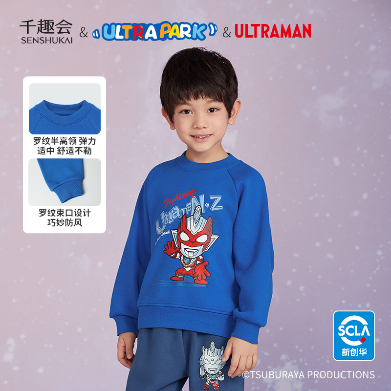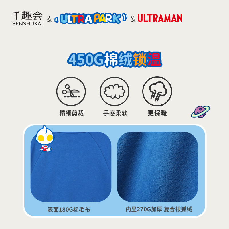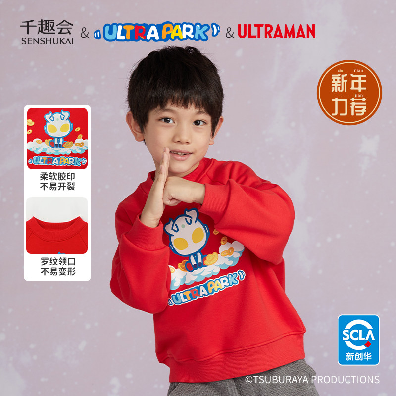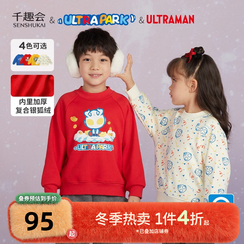 千趣会童装秋冬奥特曼男女童加绒加厚银狐绒卫衣新年红色上衣