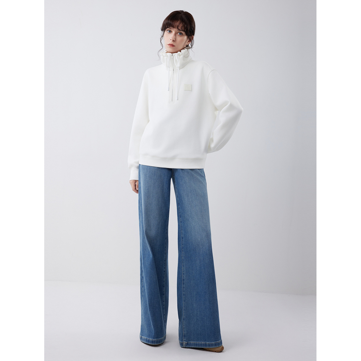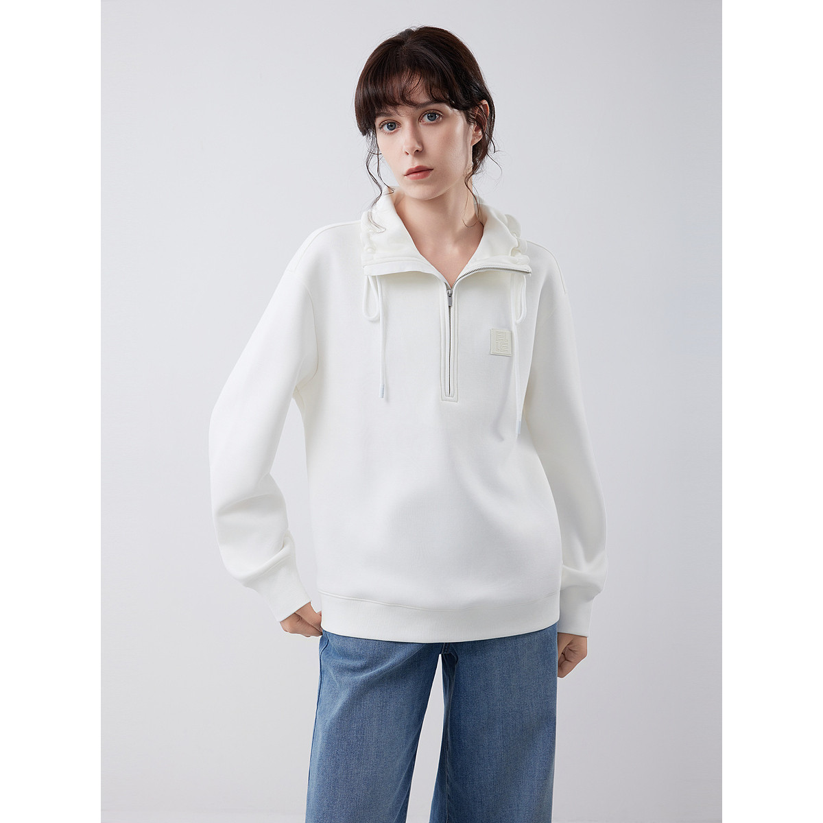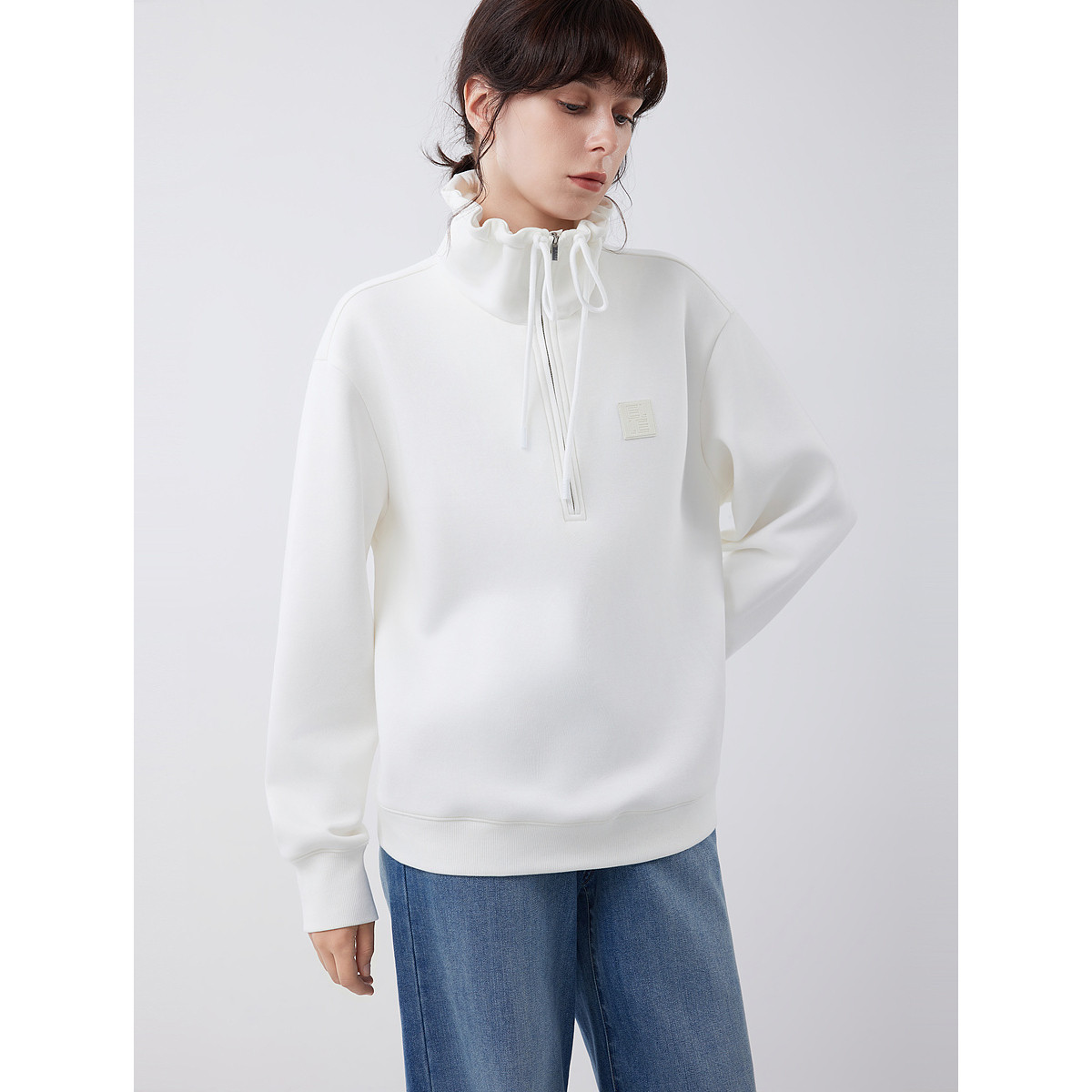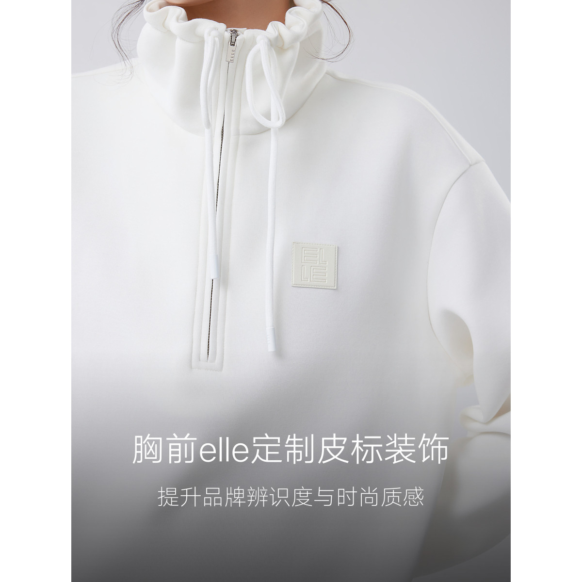 ELLE白色设计感休闲卫衣女2025冬季新款高级感立领套头宽松上衣