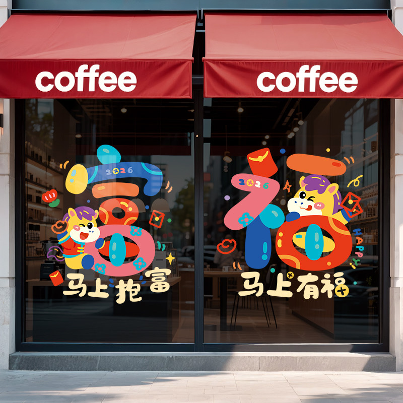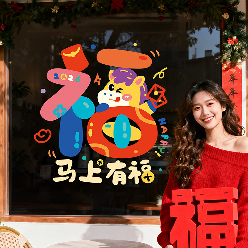 2026新年店铺装饰卡通福春玻璃静电窗花氛围布置马年春节过年贴纸