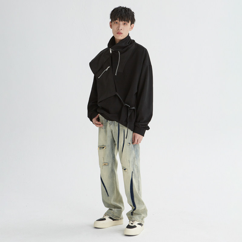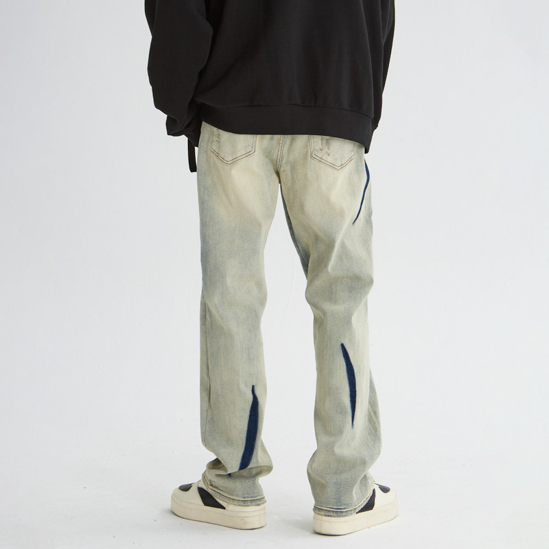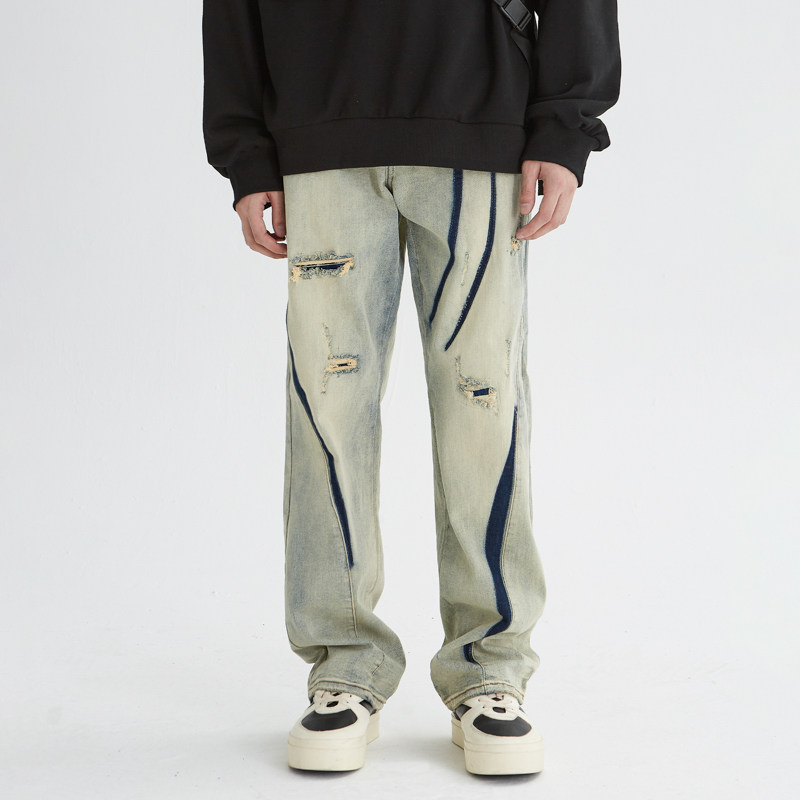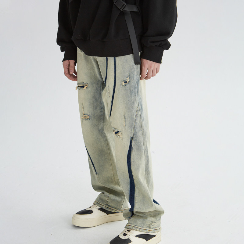 新因素破洞补丁牛仔裤男秋冬季黄泥染水洗做旧美式高街阔腿直筒裤