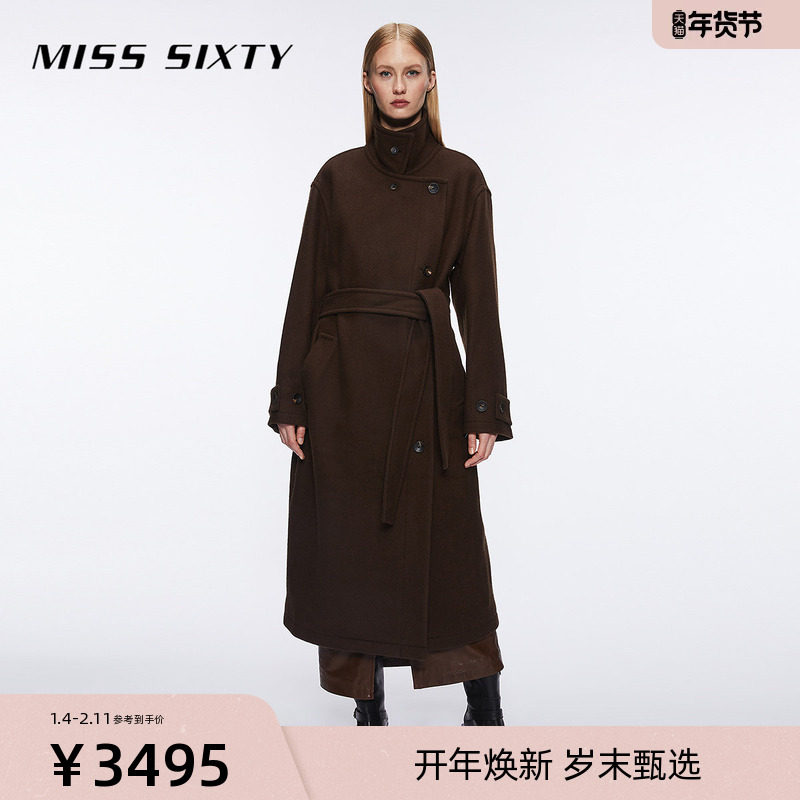 Miss Sixty棕色绵羊毛呢大衣女高级感气质附腰带通勤长款外套