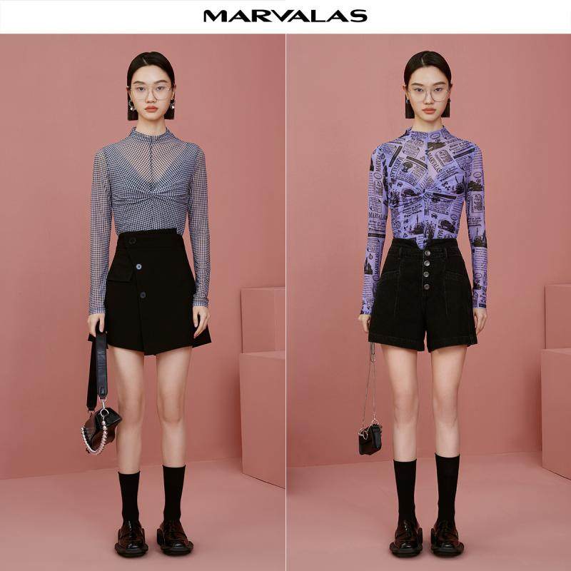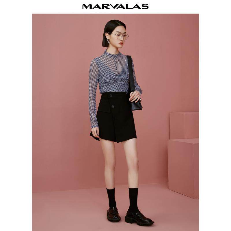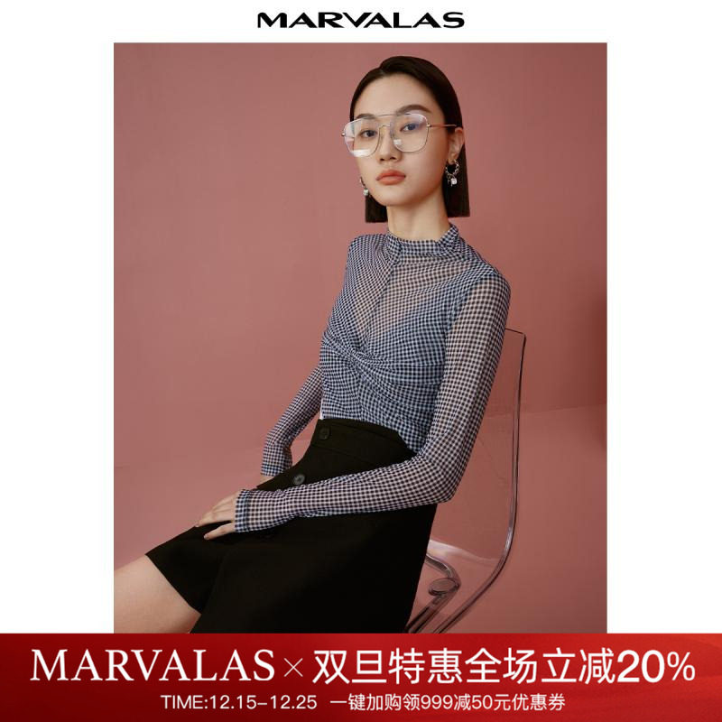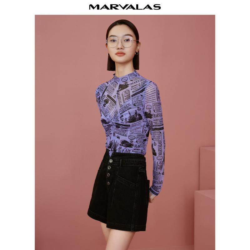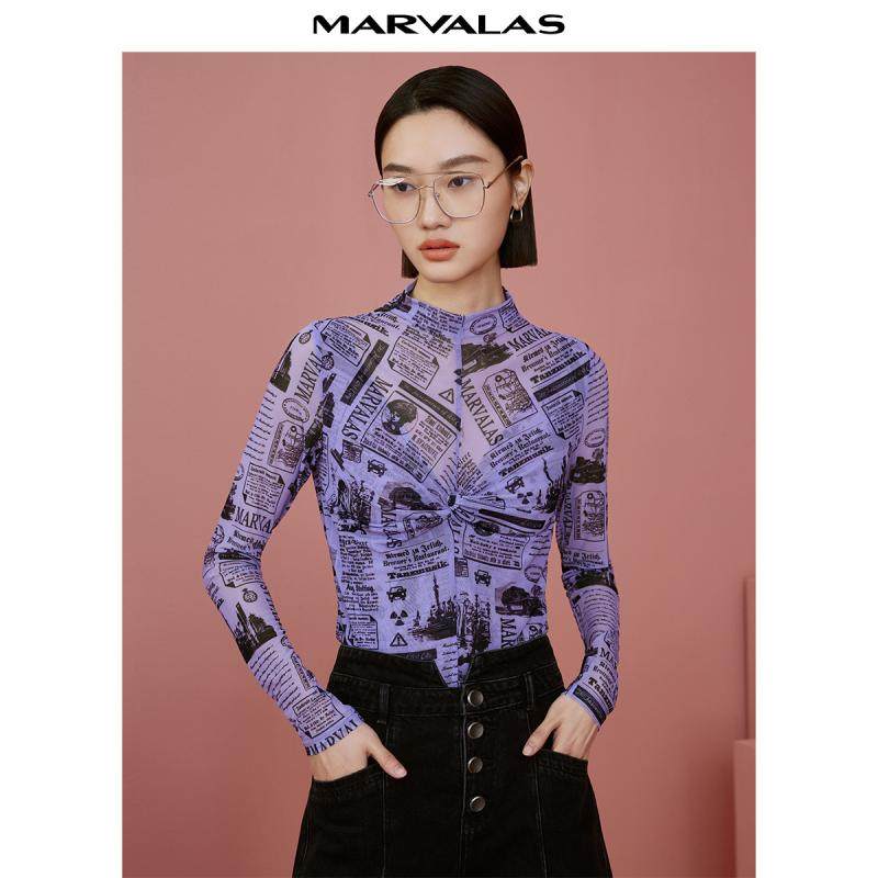 曼德诗设计感网纱雪纺衫2025秋装新款半高领复古印花假两件上衣