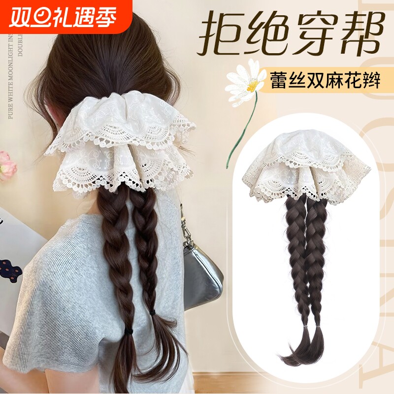 假发辫子女抓夹仿真发低马尾蕾丝双麻花长辫子发饰新中式马尾假发