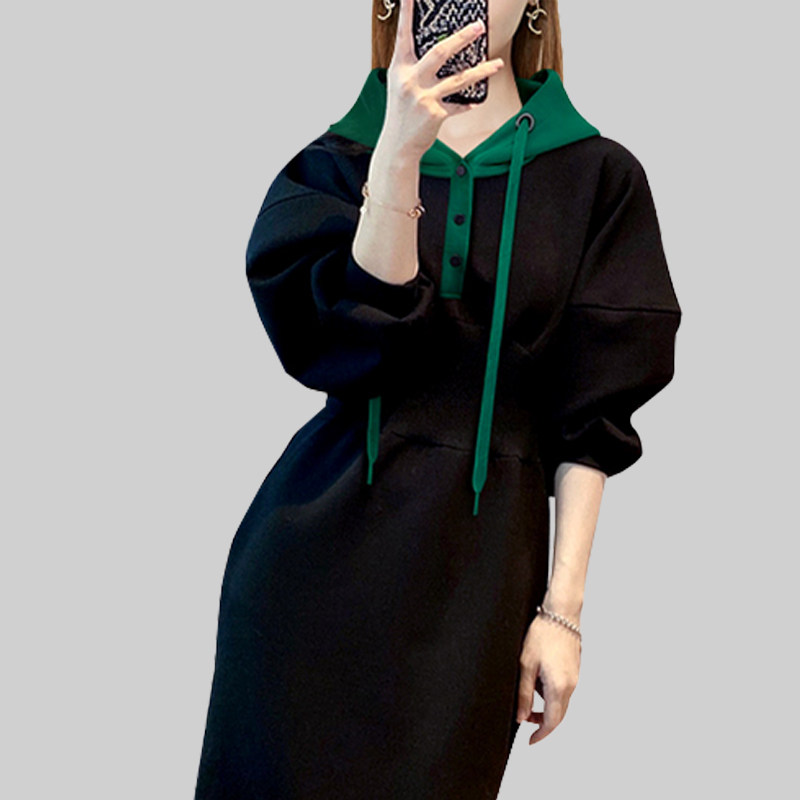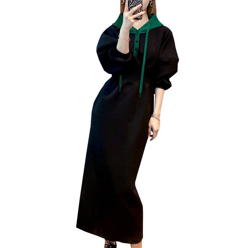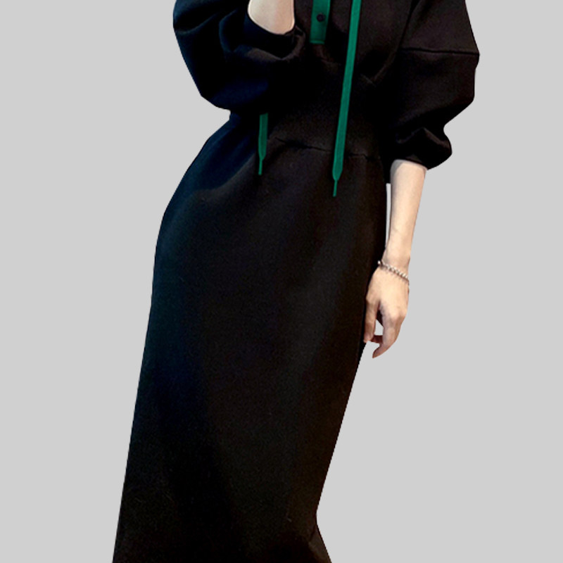 黑色连帽连衣裙女秋冬新款今年流行设计感小众显瘦休闲长款卫衣裙