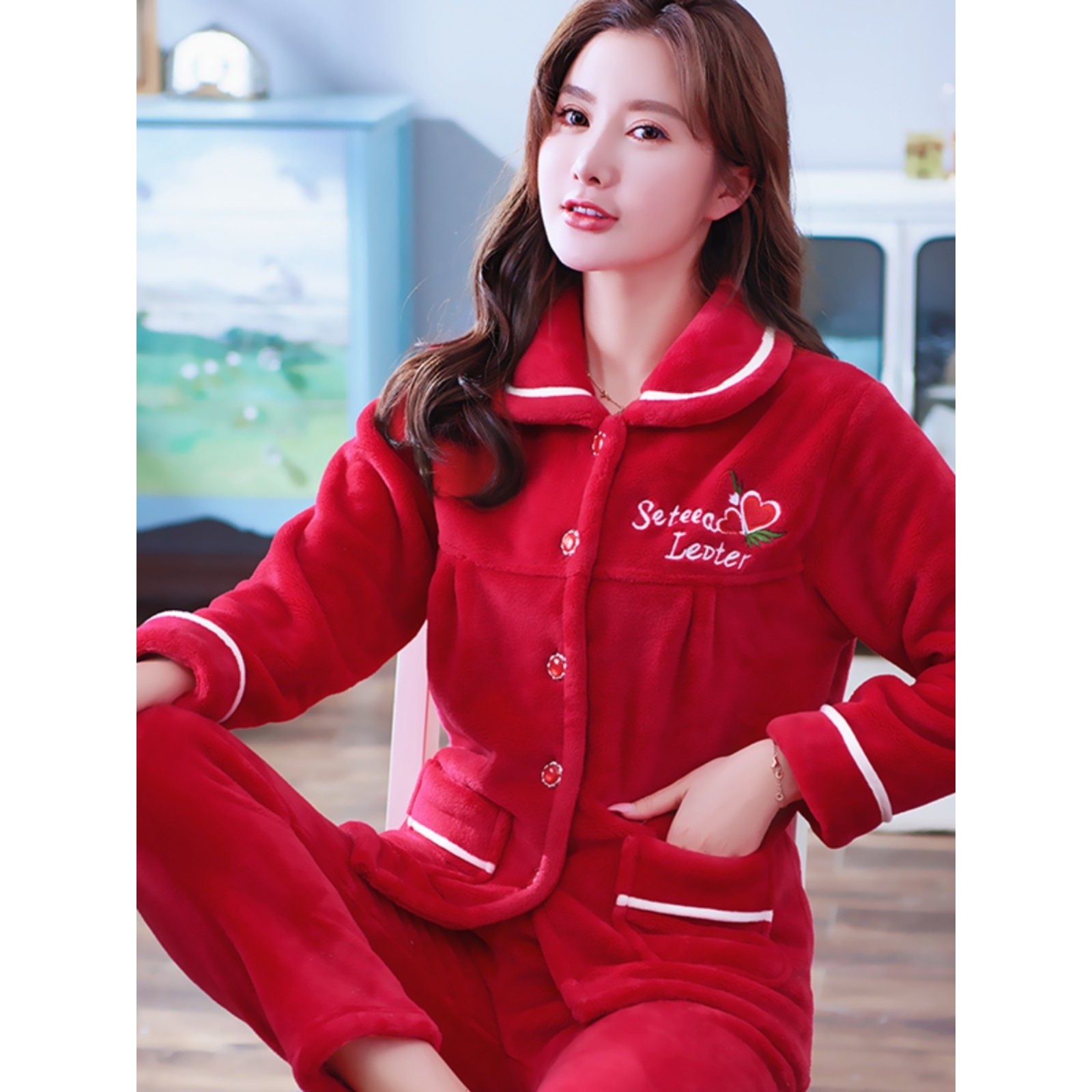 红豆秋冬季加厚珊瑚绒睡衣女冬法兰绒加绒套装春秋开衫大码女士家