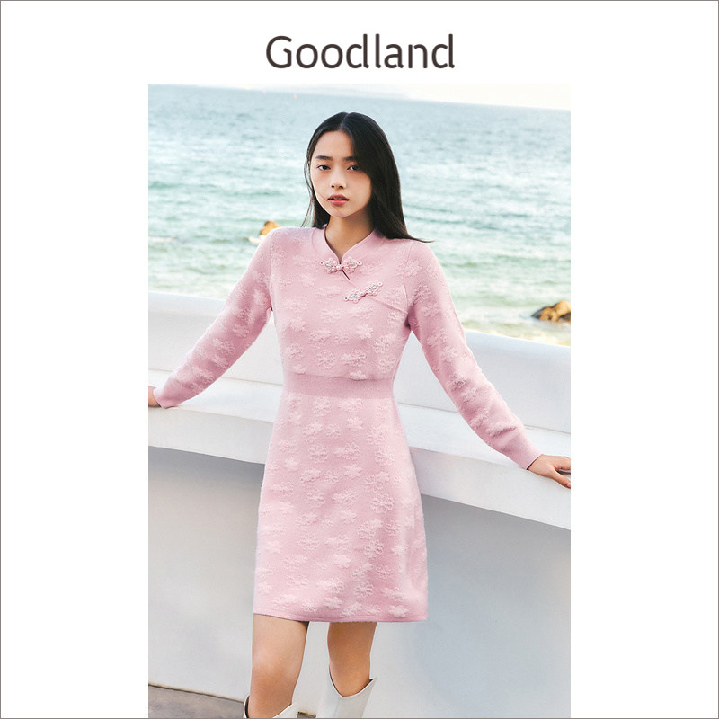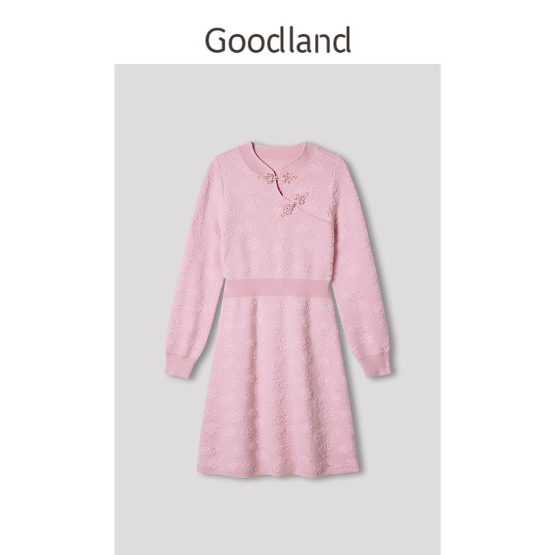 【新中式】Goodland美地冬季女装格桑花提花盘扣针织连衣裙