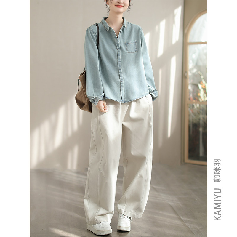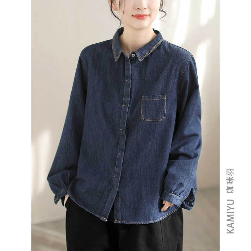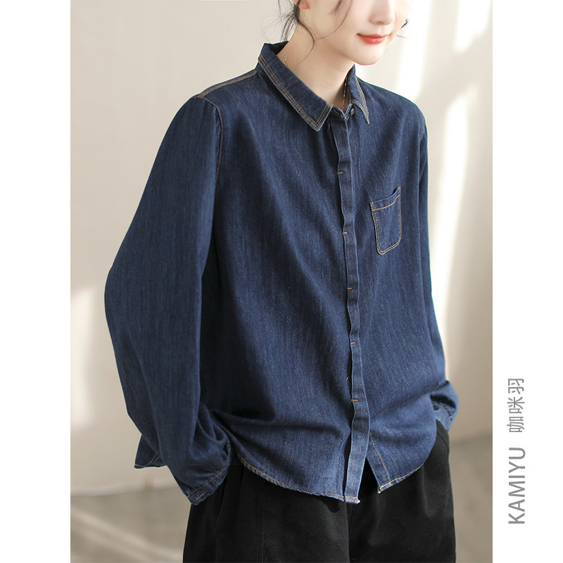 咖咪羽牛仔衬衫女春装新款时尚纯色牛仔棉垂感翻领高端女装开衫女