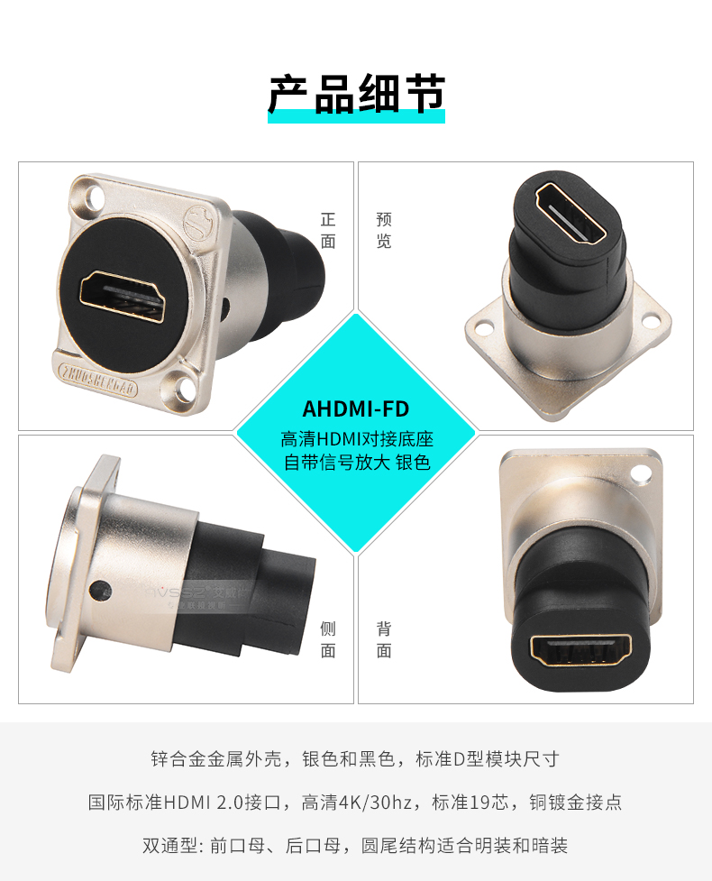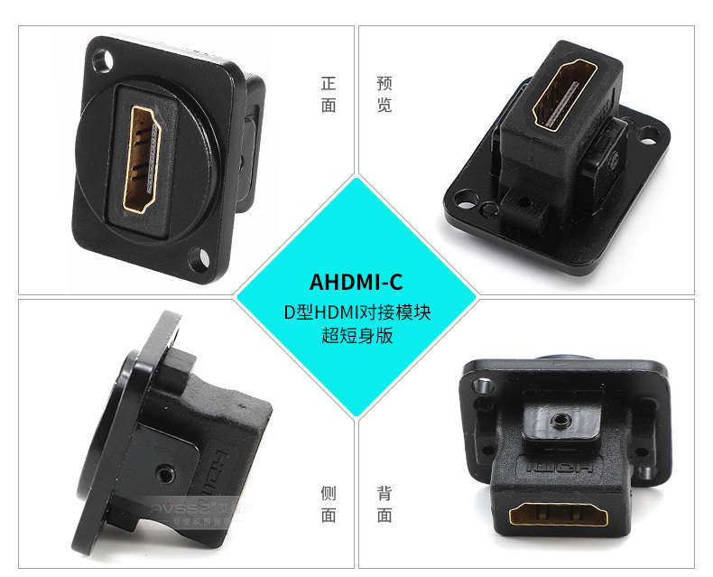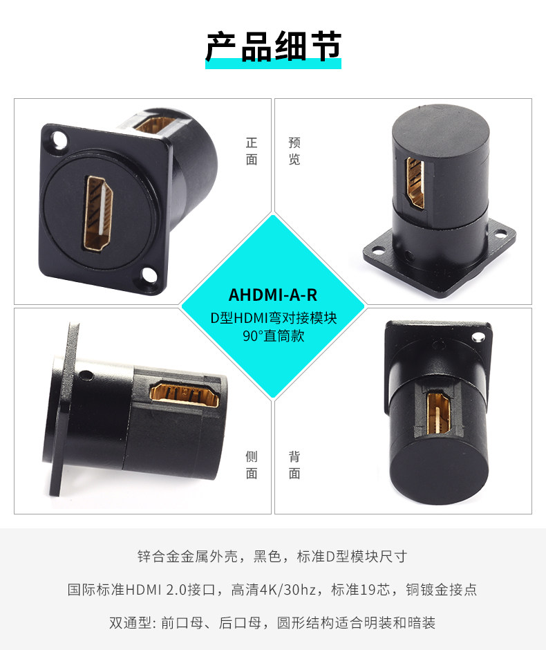 D型高清音视频线HDMI2.0高速双通模块会议室弯母对母对接座直角AV