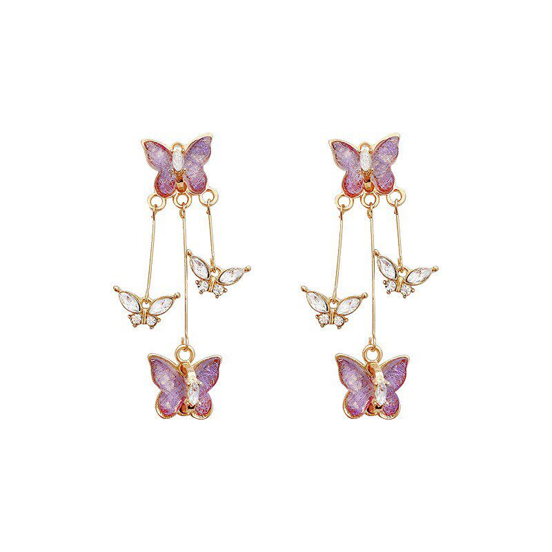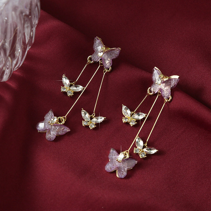 紫色蝴蝶流苏耳环女高级感闪钻长款耳坠气质耳饰多规格