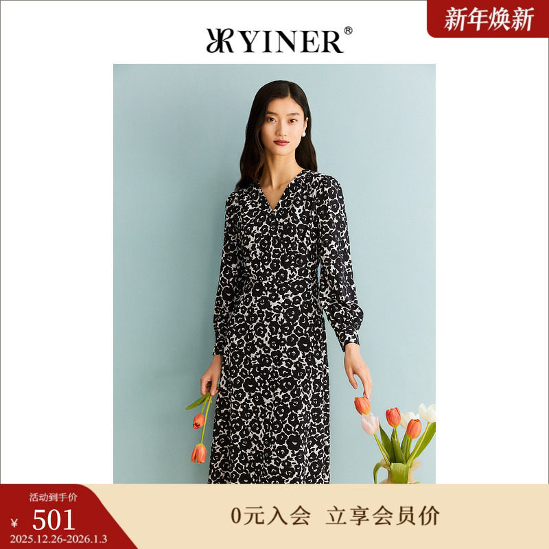YINER音儿专选女装秋季花朵印花V领收腰公主袖连衣裙