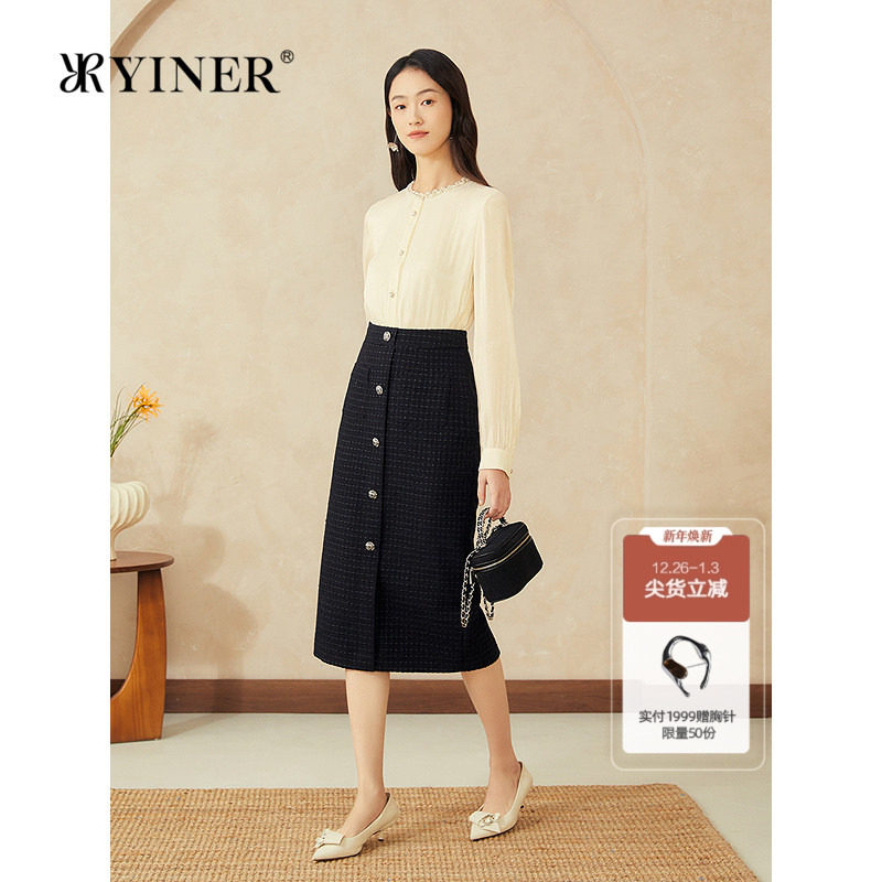 YINER音儿专选2025春季新款法式小香风闪丝高腰直筒廓形半身裙