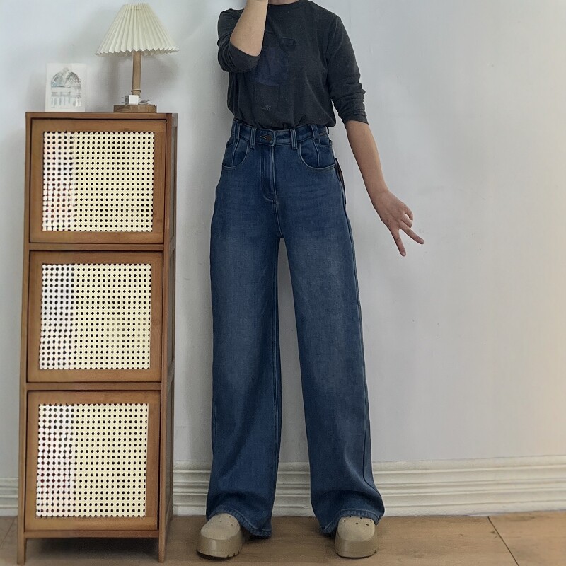王家有鱼加绒小个子复古蓝直筒阔腿裤女2025年秋冬新款百搭牛仔裤