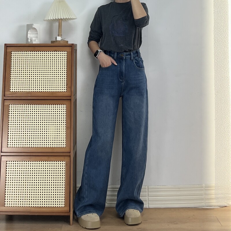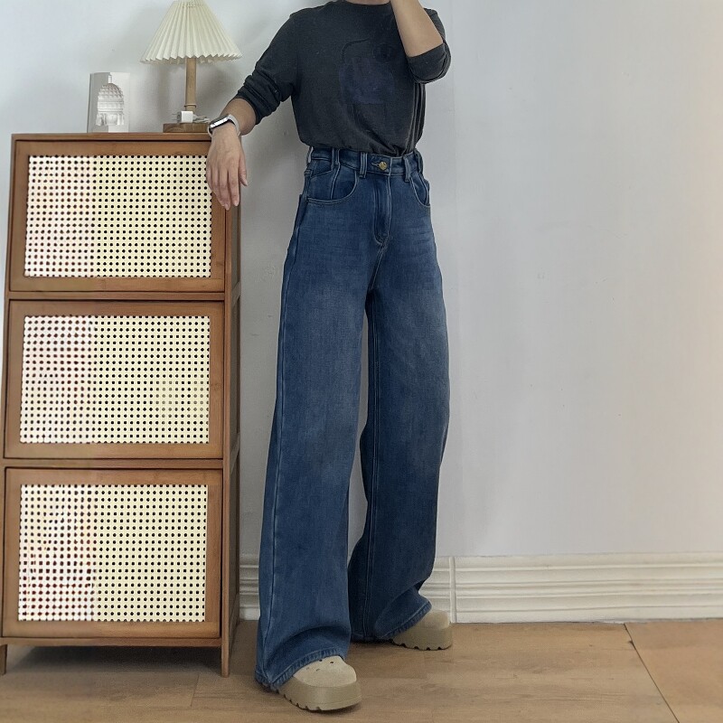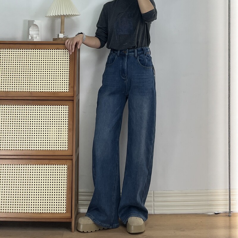 王家有鱼秋冬新款加绒阔腿裤2025百搭修身显瘦宽松直筒牛仔裤子女