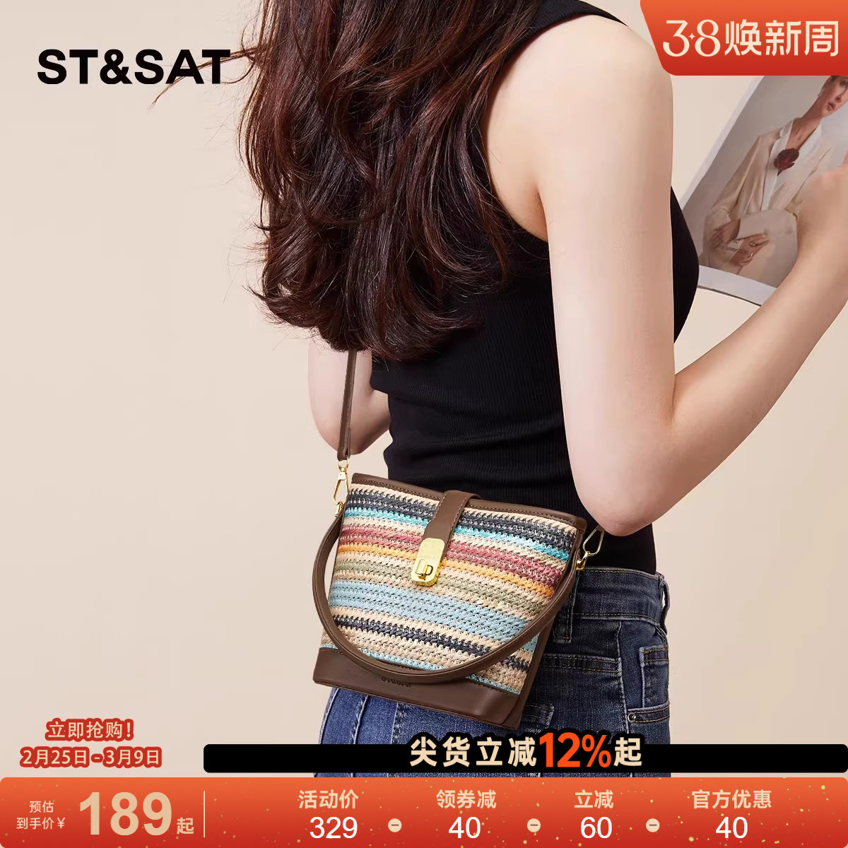 星期六水桶包2026新款包包手提斜挎包彩虹编织包草编高级感菜篮子
