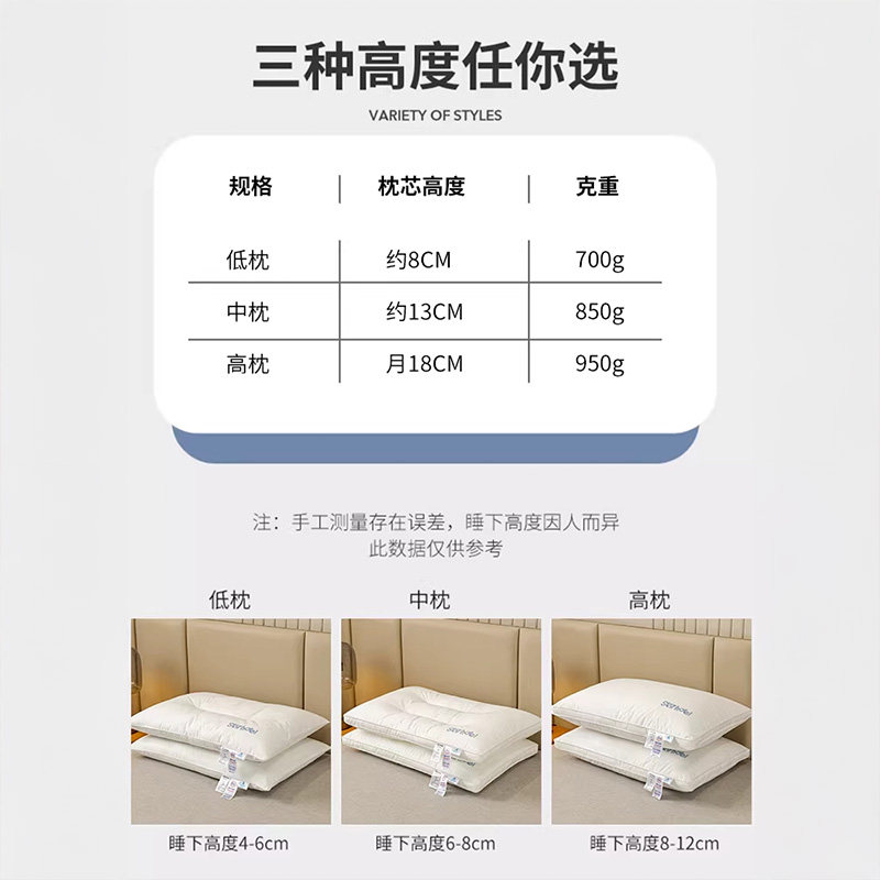 A类母婴枕头护颈椎枕芯助睡眠学生宿舍男酒店专用单人低家用一对