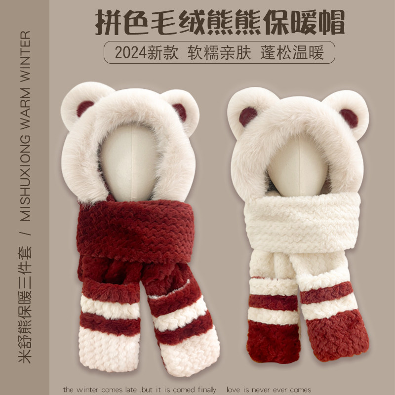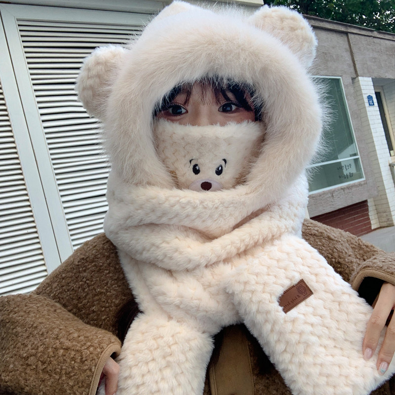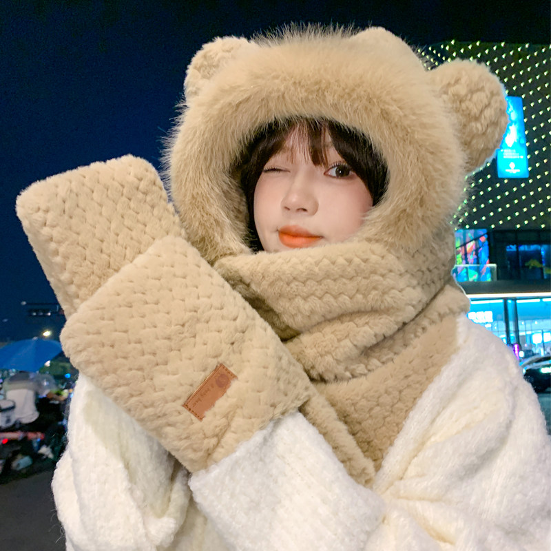帽子女冬2025新款小熊可爱加厚东北防寒围巾手套一体连帽保暖围脖