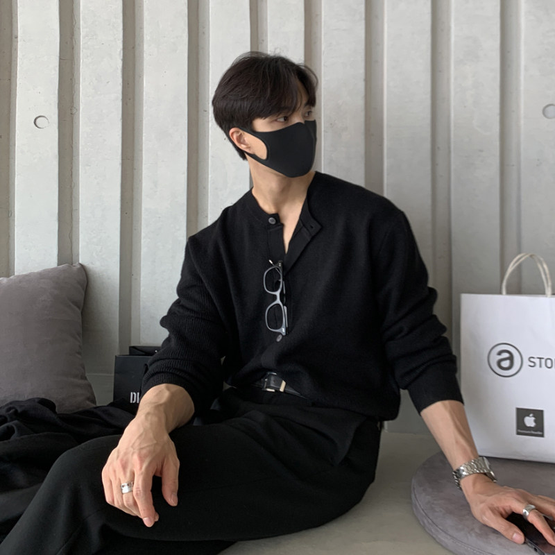 NOFUNNULL 美式亨利领纽扣套头毛衣男秋冬宽松休闲圆领针织衫上衣