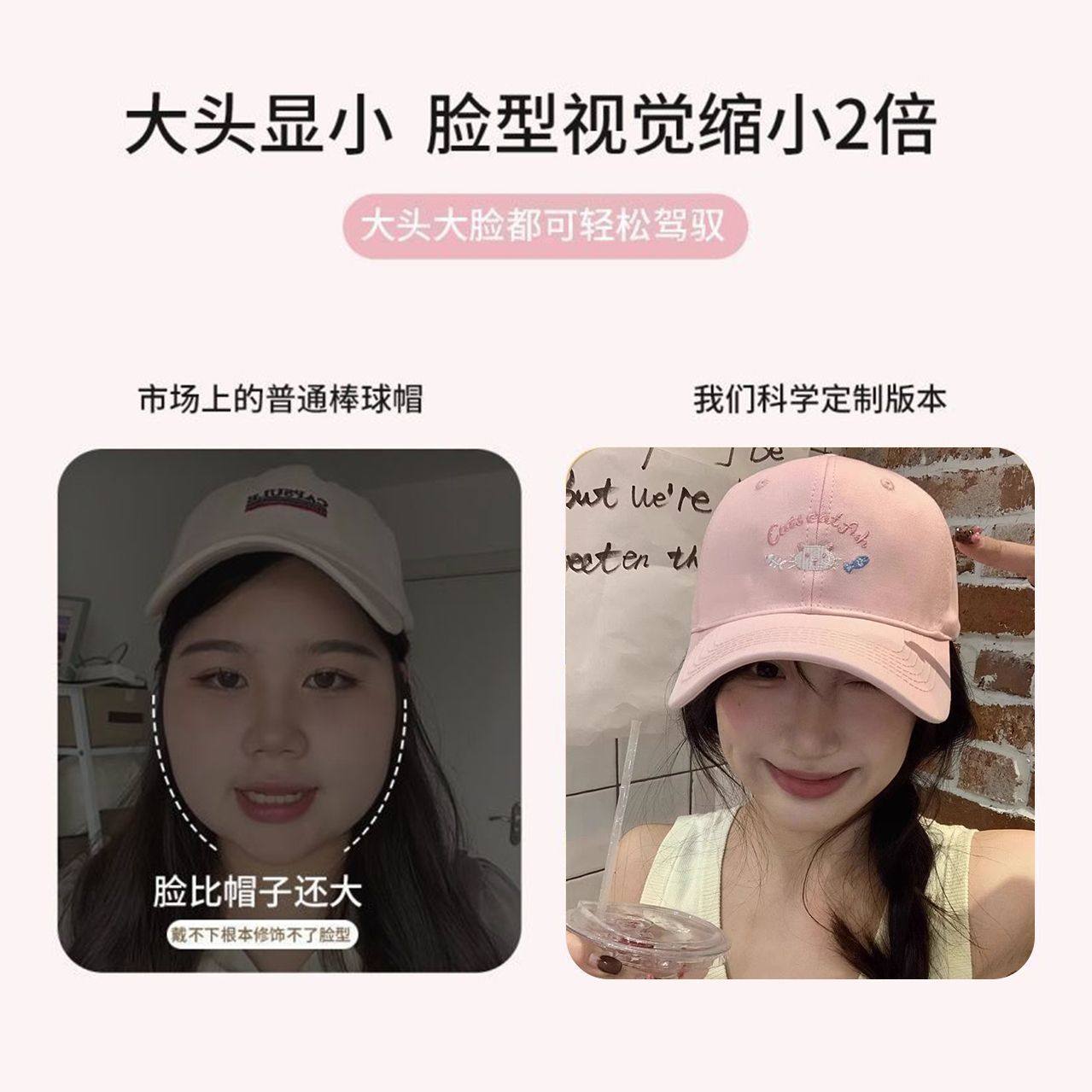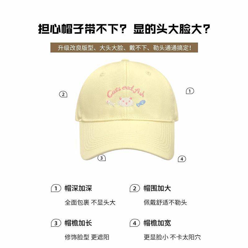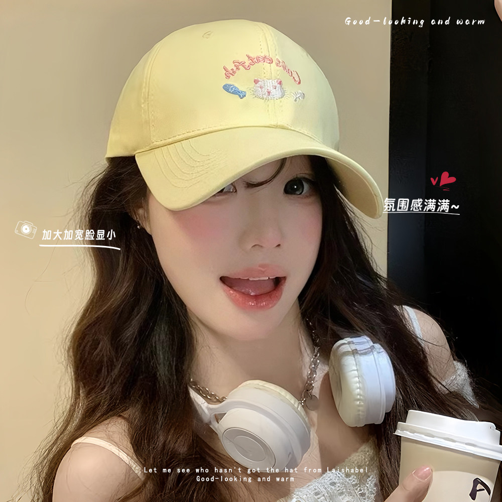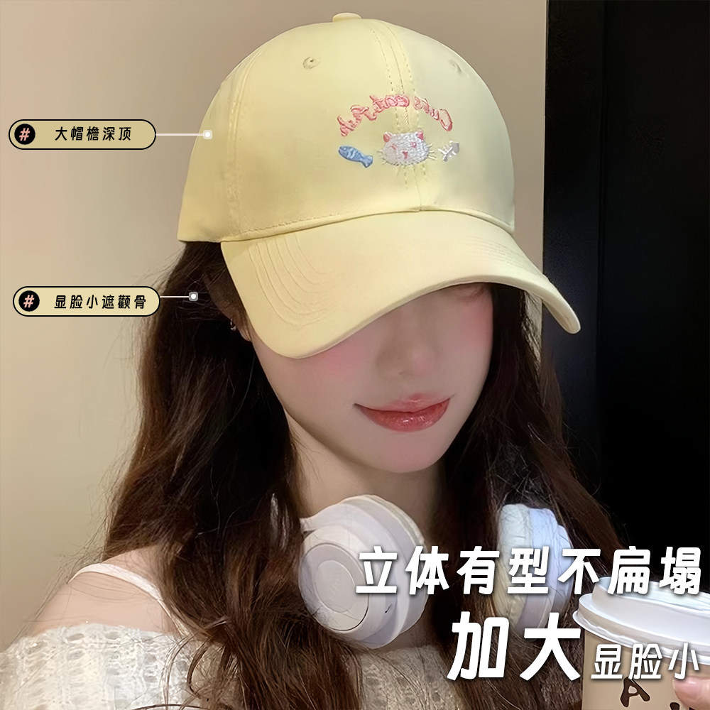 可爱小猫黄色棒球帽女春夏季大头围宽檐显脸小鸭舌帽韩版百搭帽子