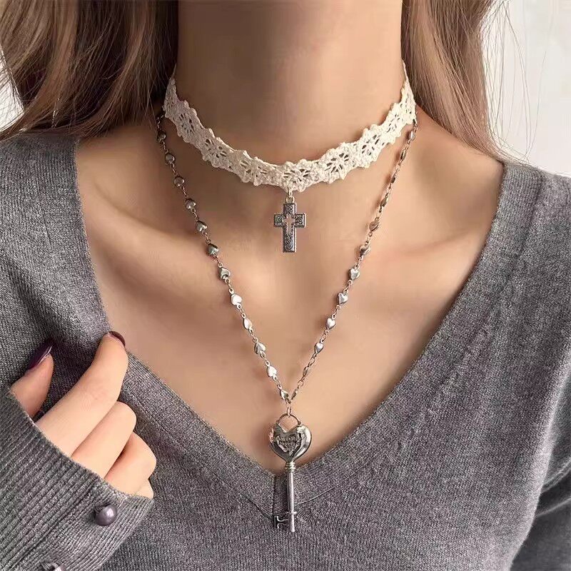 甜酷白色蕾丝十字架绑带choker叠戴爱心钥匙项链女小众设计感颈链