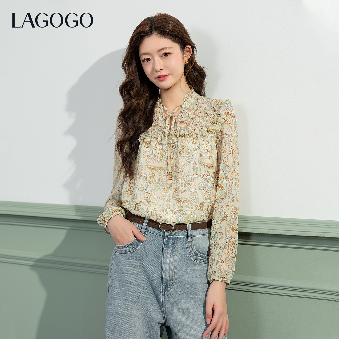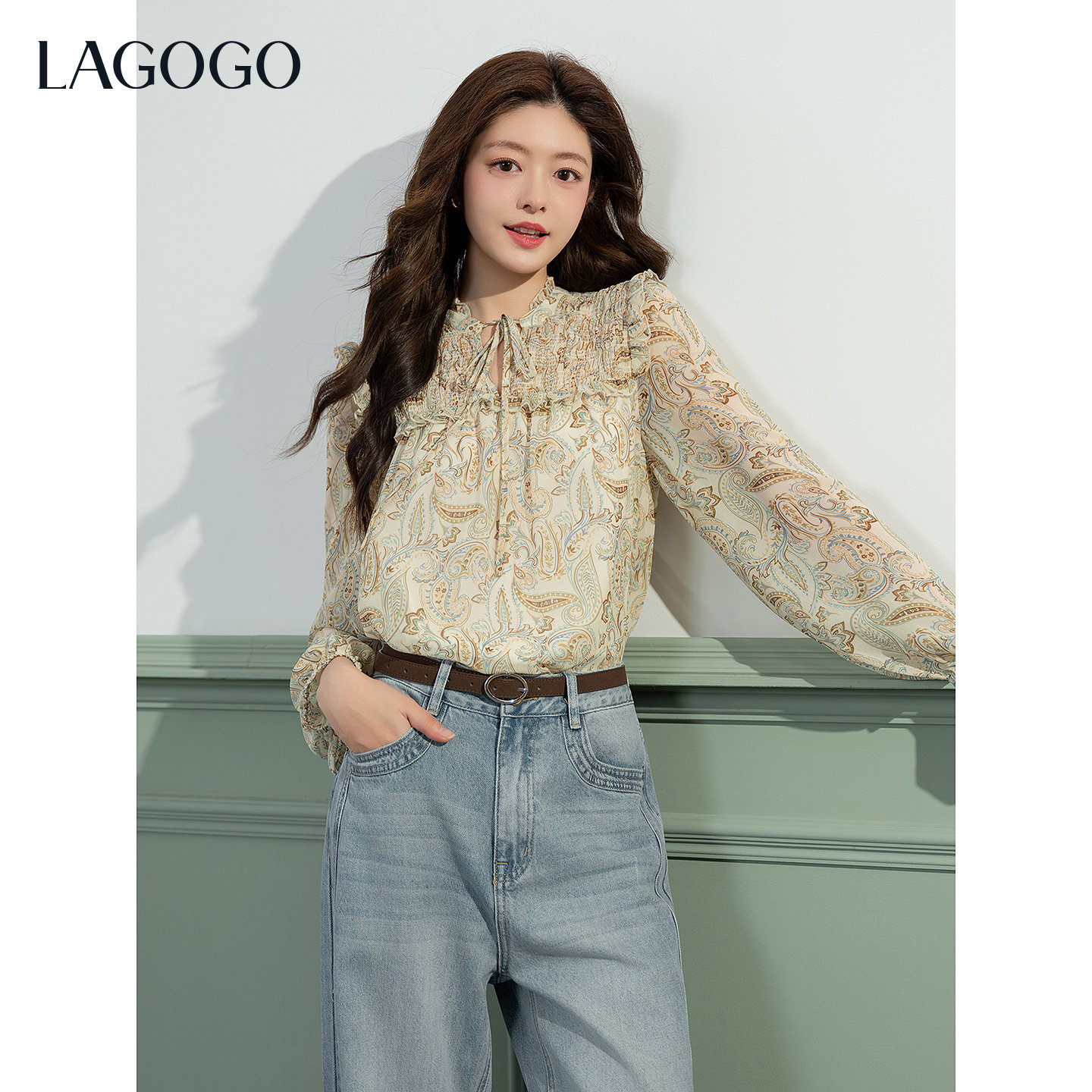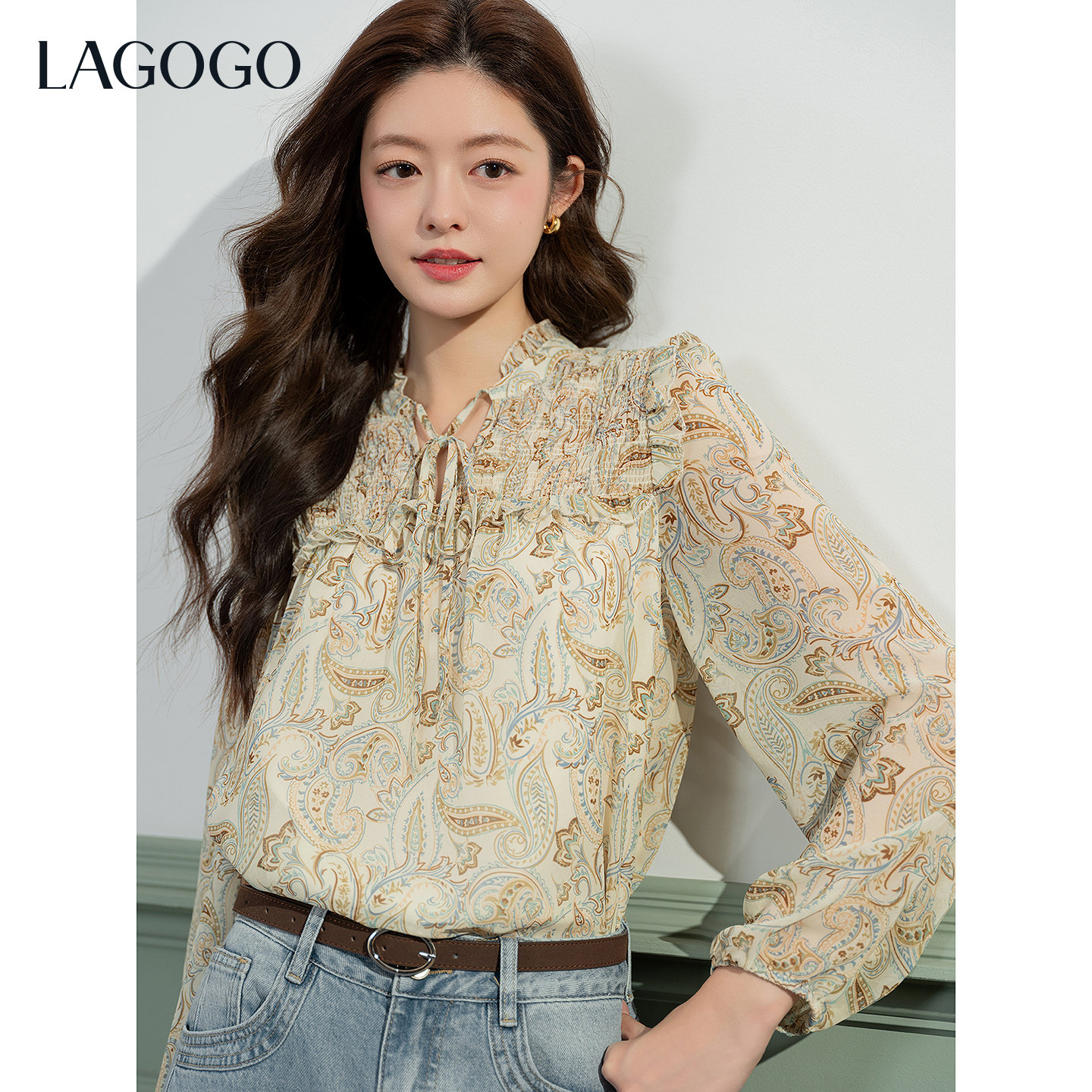 LAGOGO复古碎花雪纺衫女拉谷谷2026春新款优雅木耳边长袖衬衫上衣