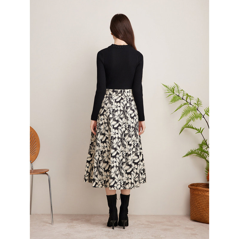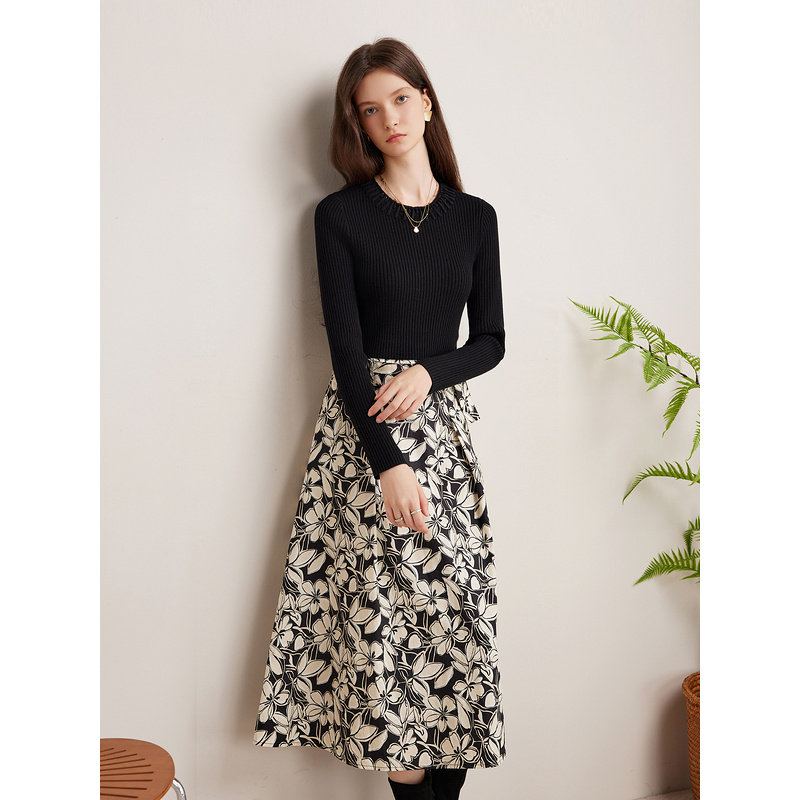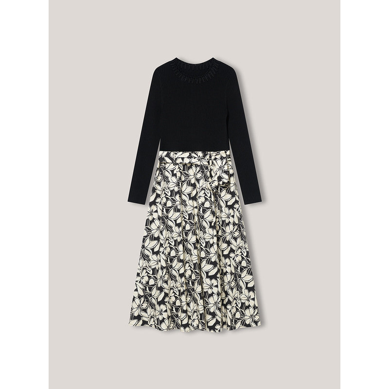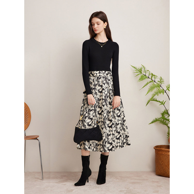 Goodland美地女装秋季撞色黑白碎花假两件针织连衣裙