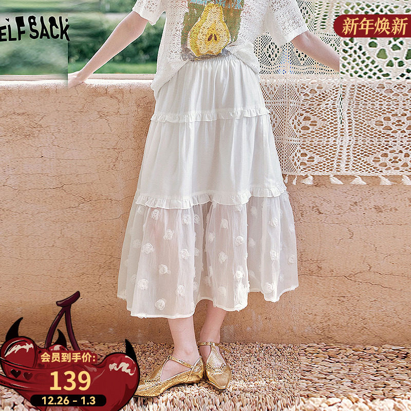 妖精的口袋白色花朵莱赛尔半身裙女2025年夏季新款高腰甜美中长裙