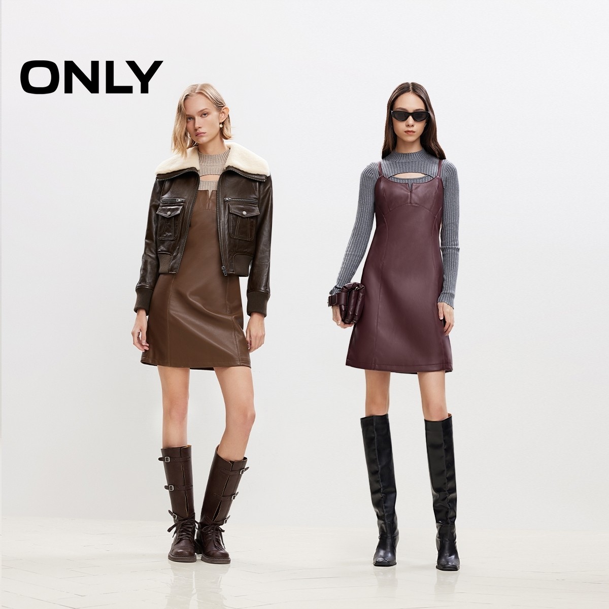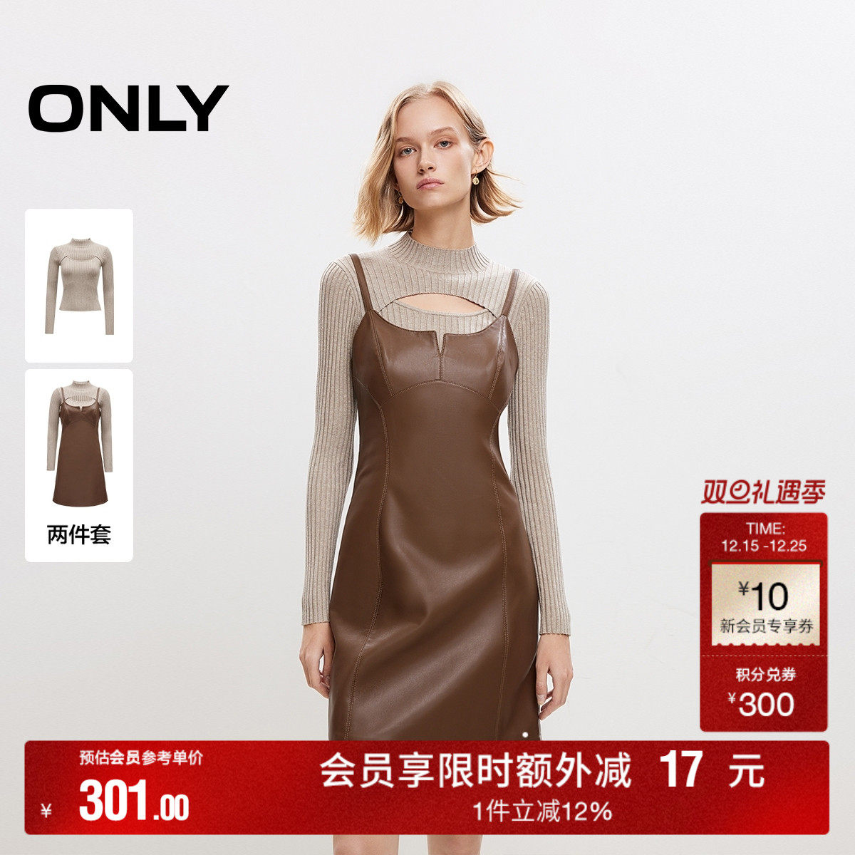 ONLY奥莱秋冬「琥珀流光风」时尚优雅显瘦PU拼接短裙套装连衣裙女