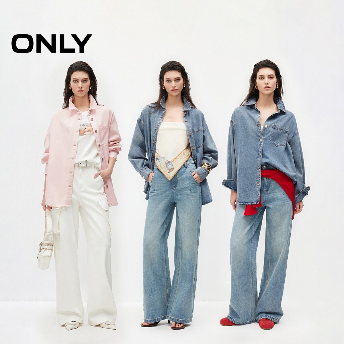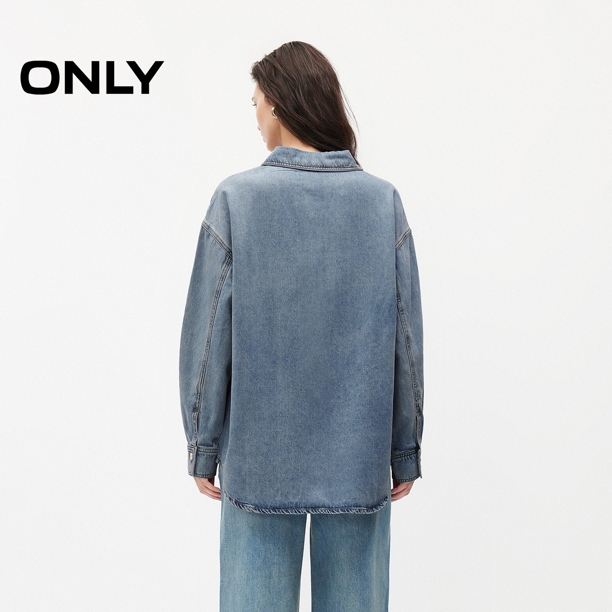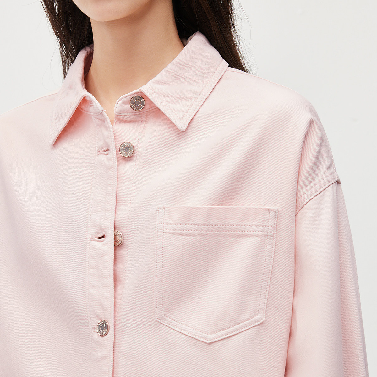 【莱赛尔】ONLY2026春季新款松驰感弧形下摆粉色牛仔衬衫上衣女