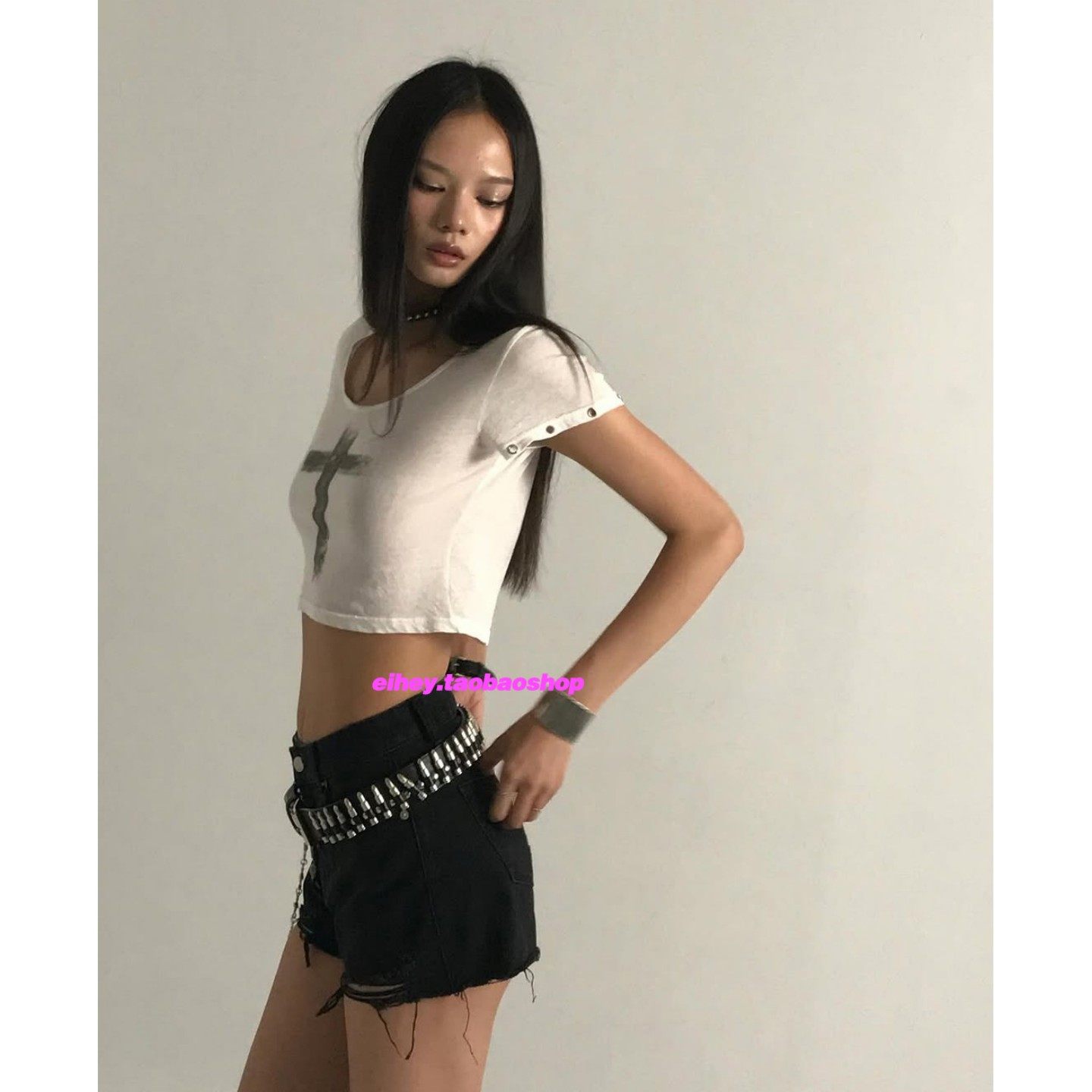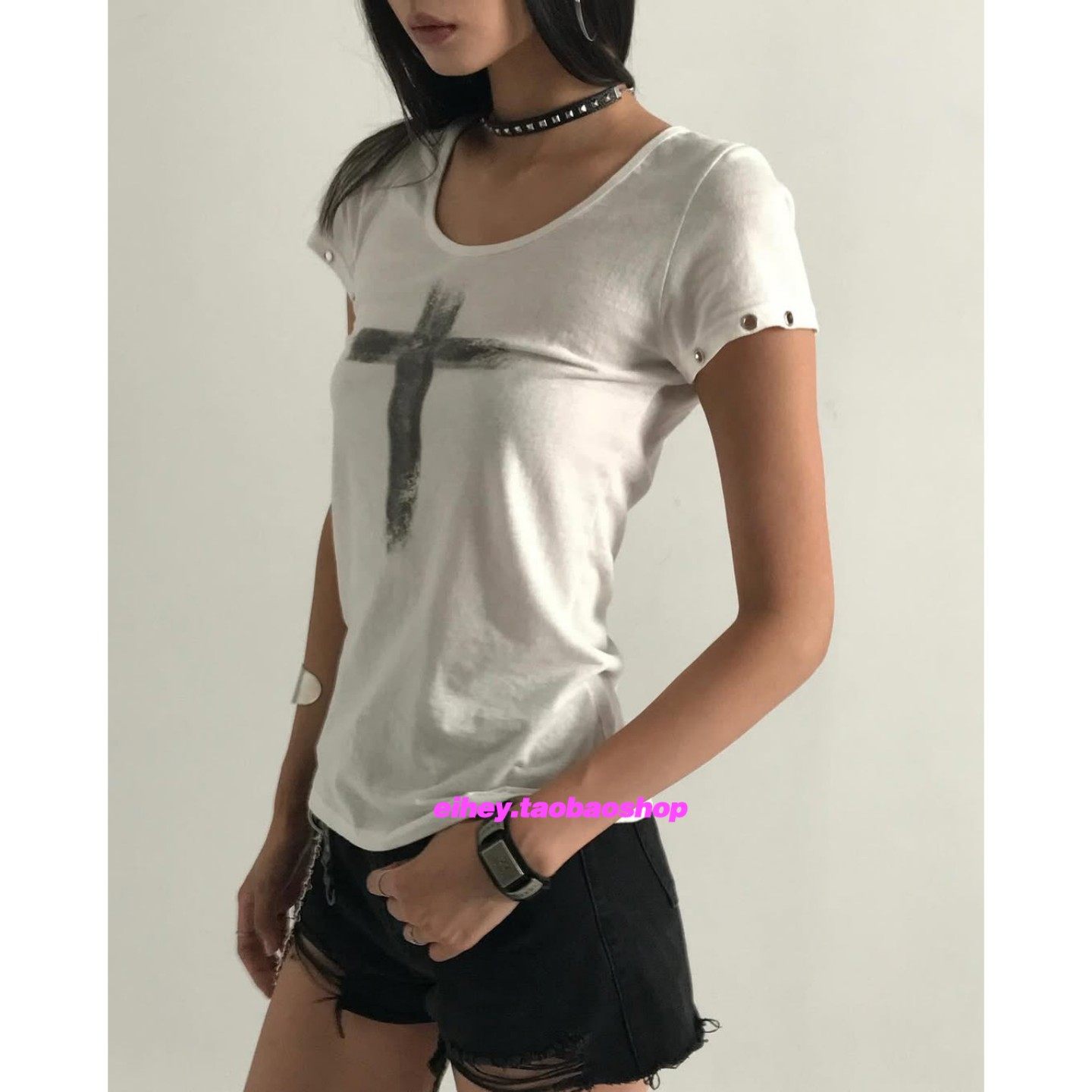 eihey诶嘿夏季新款十字架印花上衣女夏美式辣妹短款时尚短袖t恤女