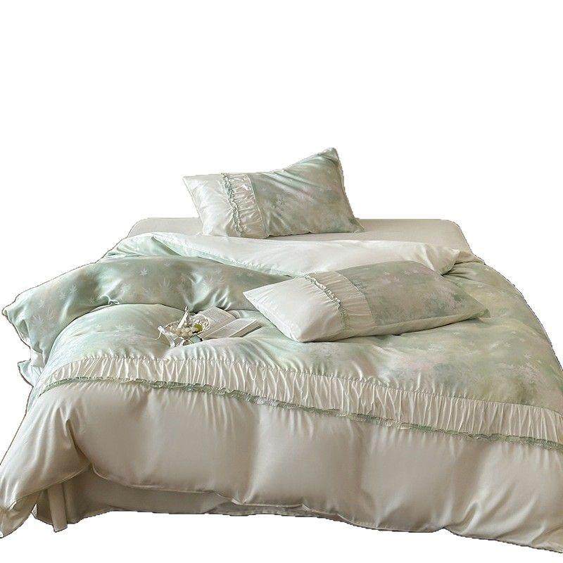 油画风凉感莱赛尔纤维四件套春夏清新印花褶皱边丝滑被套床品蓝色