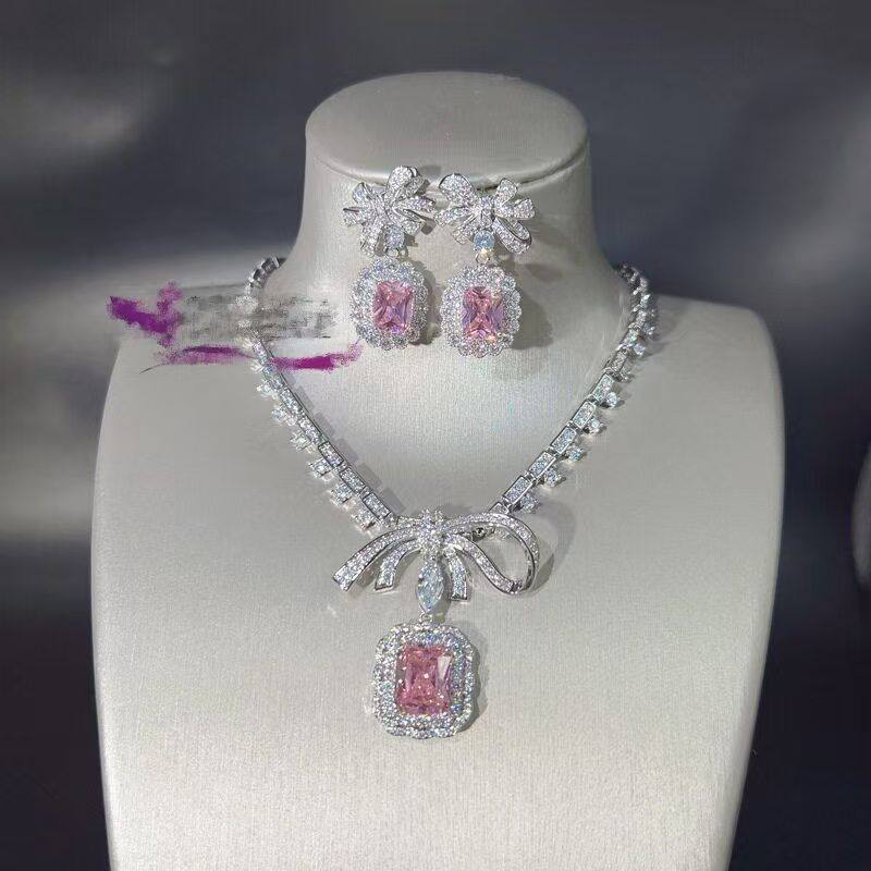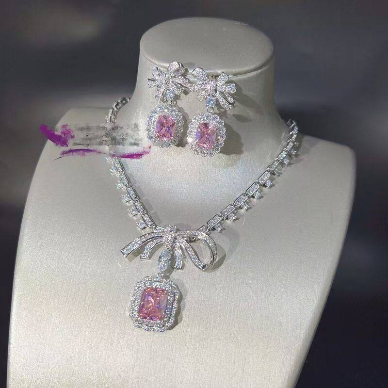vintage重工粉色蝴蝶结满钻耳坠吊坠项链套装时尚气质设计感饰品