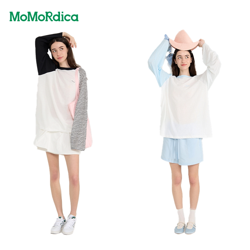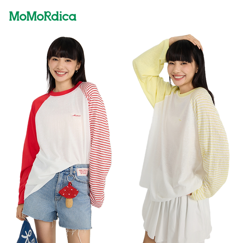 【晁然推荐】条纹双拼色T恤女打底衫中长款圆领长袖衬衣