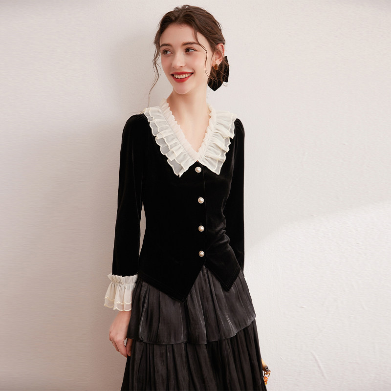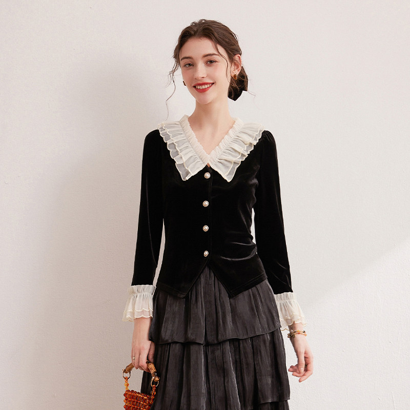 白鹿语法式网纱荷叶边V领衬衫秋新款千金风撞色拼接女式上衣