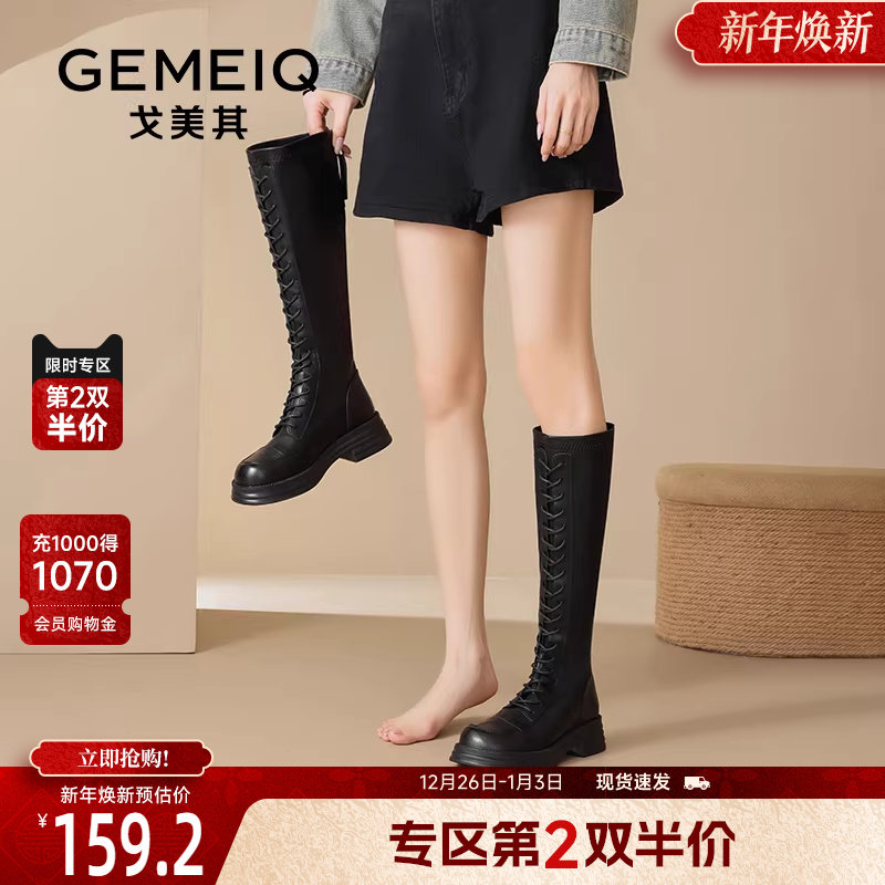 戈美其靴子长筒靴女舒适新款春秋季显瘦英伦风潮酷机车绑带骑士靴