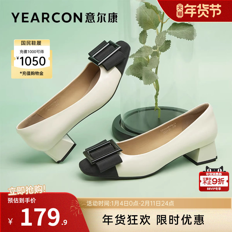意尔康女鞋春秋季方头粗跟浅口单鞋中跟皮鞋通勤气质工作鞋配裙子