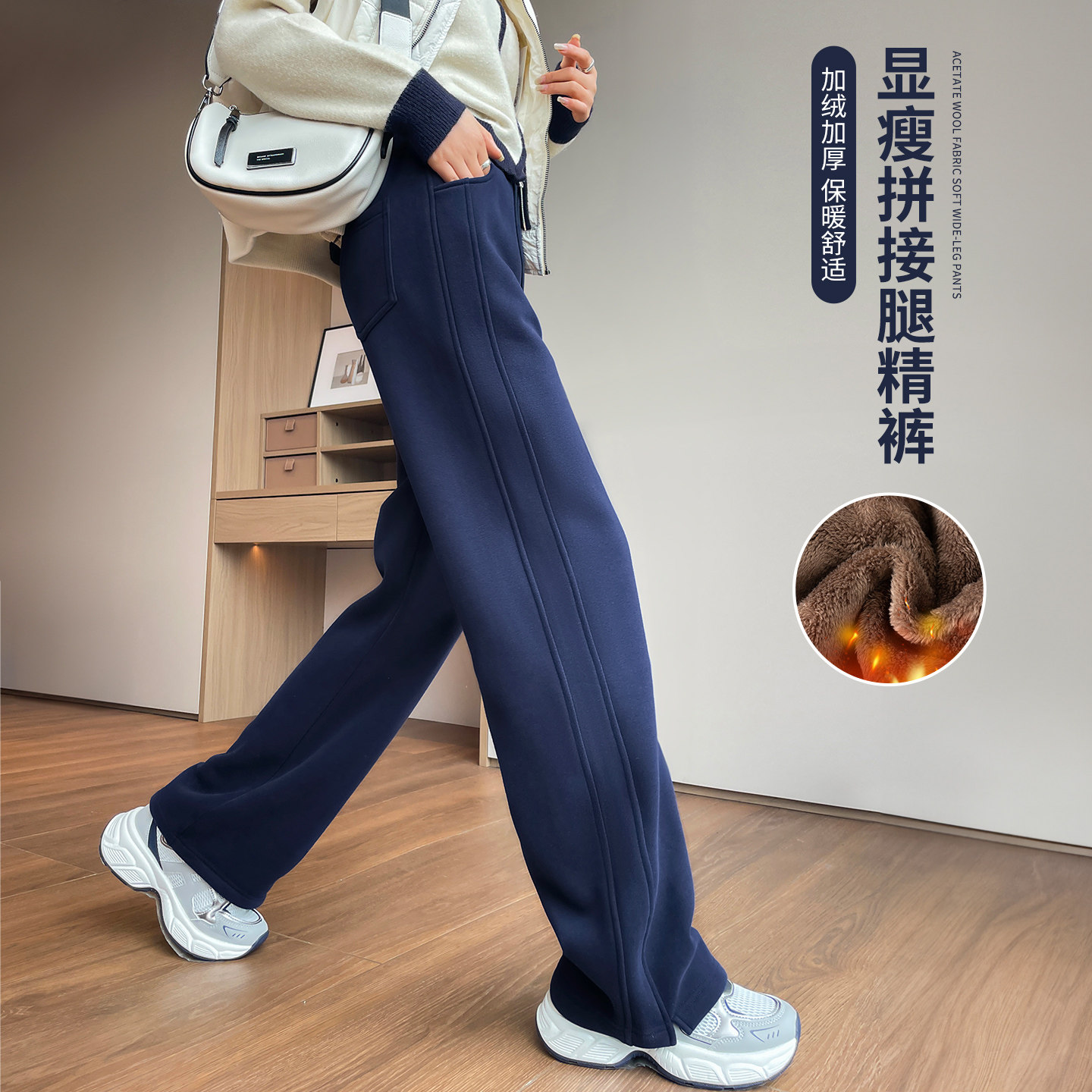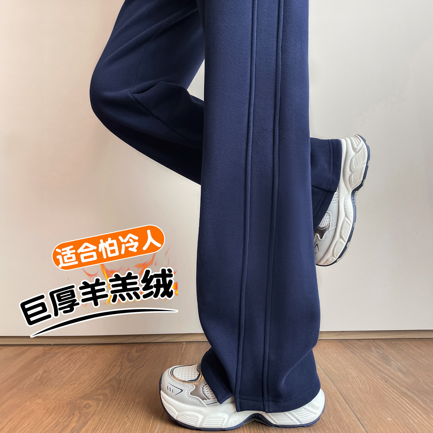 藏青色加绒加厚阔腿裤女秋冬季东北外穿棉裤特厚羊羔绒直筒卫裤子