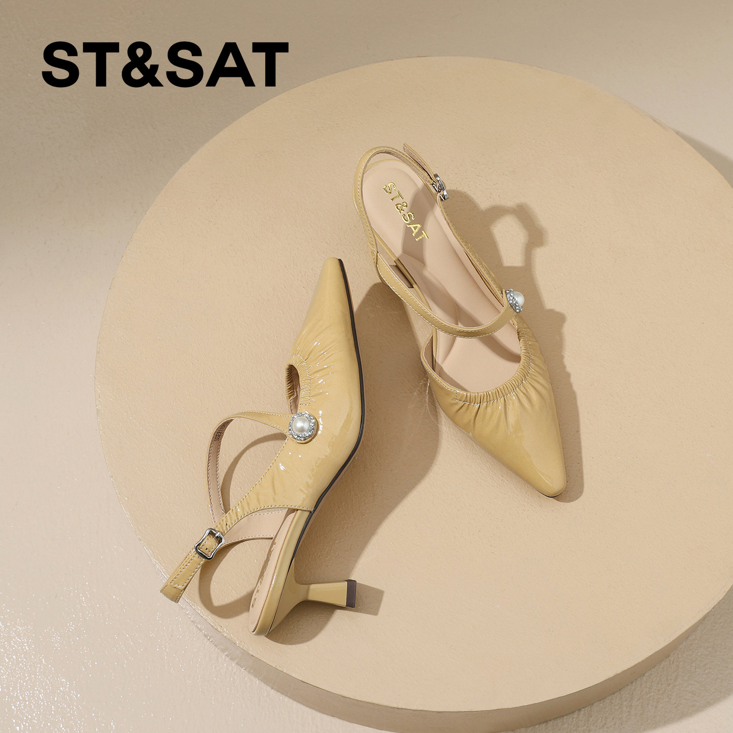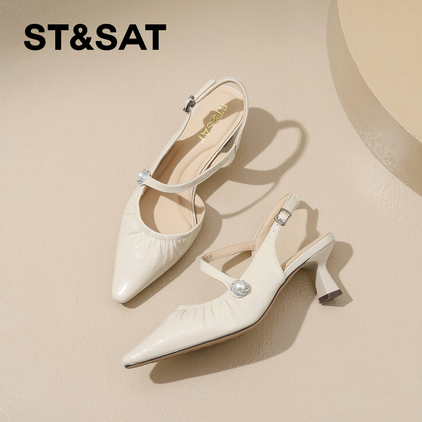 星期六优雅真皮褶皱尖头时装鞋女2026夏新款珍珠细跟包头后空凉鞋